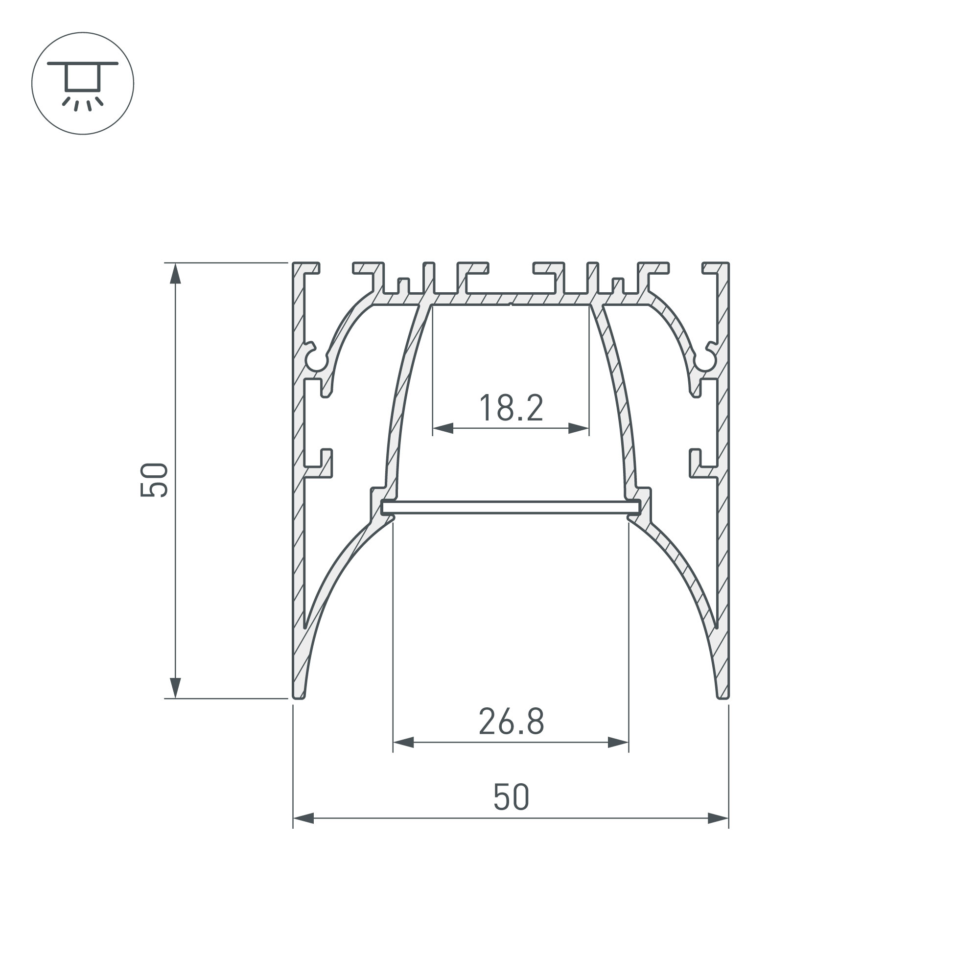 Накладно/подвесной профиль из анодированного алюминия с утопленным экраном для контурной подсветки помещений. Габаритные размеры профиля составляют 2000 мм в длину, 50 мм в ширину и 50 мм в высоту. Площадка для установки светодиодных лент позволяет использовать ленту шириной до 18,2 мм и мощностью до 52,5 Вт/м. Это обеспечивает гибкость в выборе светодиодных лент и создает потрясающие световые решения.
