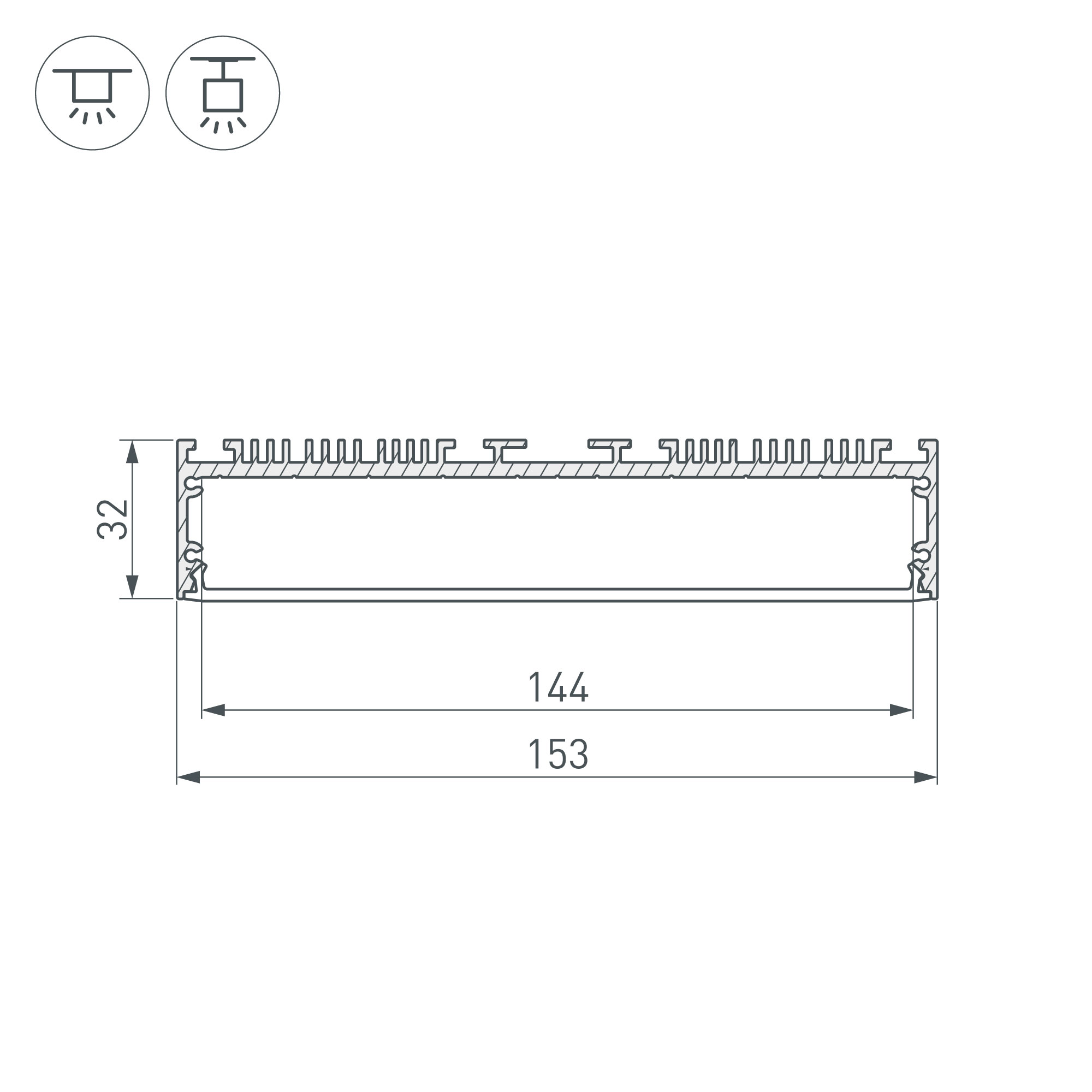Габаритные размеры профиля составляют 2000 мм в длину, 153 мм в ширину и 32 мм в высоту. Площадка для установки светодиодных лент позволяет использовать ленту шириной до 144 мм и мощностью до 97 Вт/м. Это обеспечивает гибкость в выборе светодиодных лент и создает потрясающие световые решения.