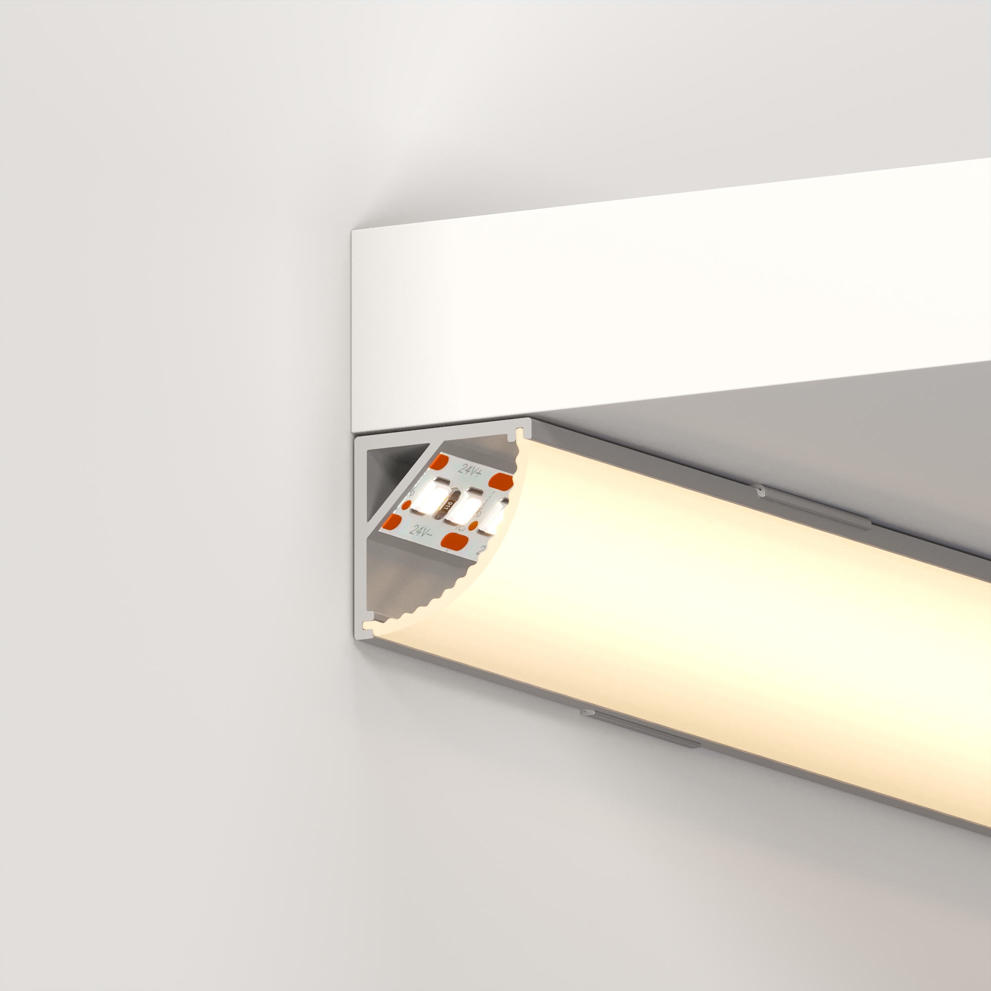 Угловой профиль из анодированного алюминия для подсветки мебели, ниш и других элементов интерьера в комплекте с матовым рассеивателем из поликарбоната со светопропусканием 74%, заглушками (2 шт.) и держателями (2 шт.). Габаритные размеры профиля составляют 2000 мм в длину, 16 мм в ширину и 16 мм в высоту. Площадка для установки светодиодных лент позволяет использовать ленту шириной до 10 мм и мощностью до 14,4 Вт/м. Это обеспечивает гибкость в выборе светодиодных лент и создает потрясающие световые решения.
