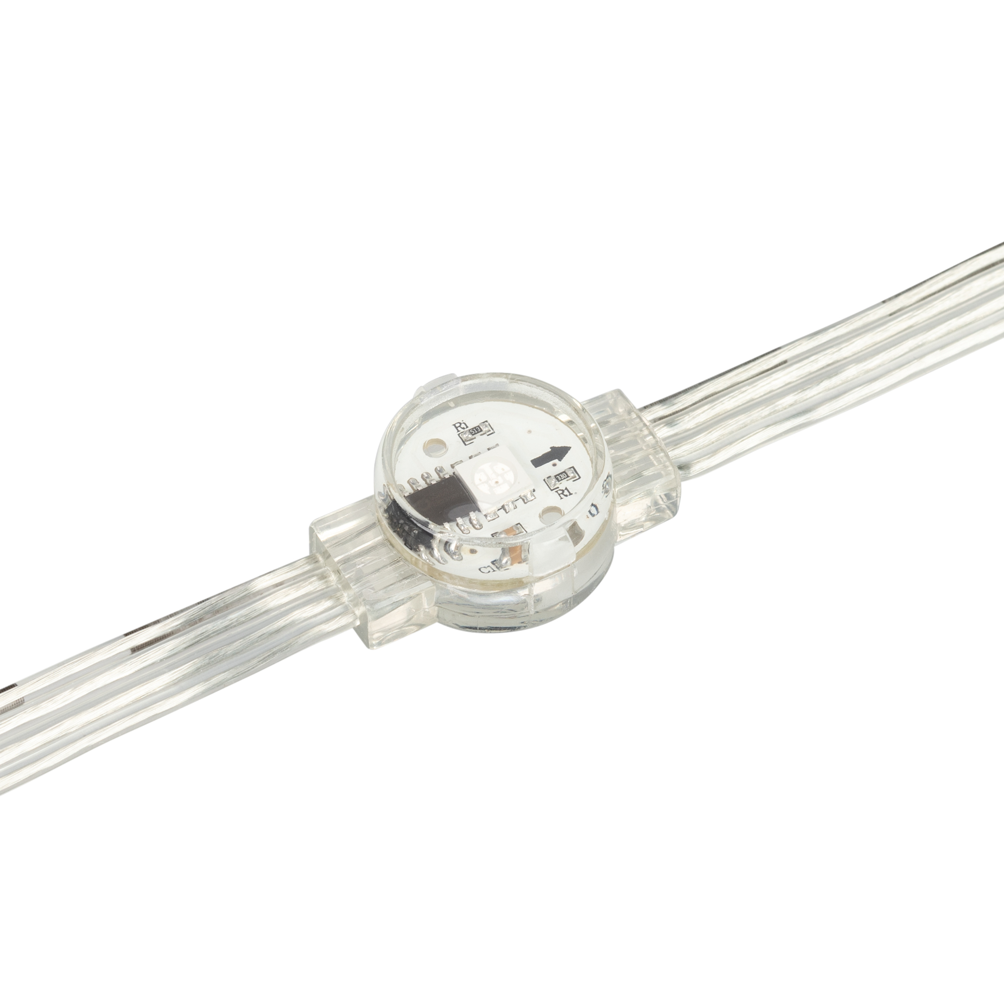 Управляемый светодиодный модуль DMX, RGB, микросхема GS8512, напряжение 12 В, мощность 0.3 Вт, 1 светодиод SMD 5060, угол 120°. Создание медиафасадов, 20 шт на проводе, расстояние между центрами модулей 105 мм, длина провода между модулями 75 мм. Степень пылевлагозащиты IP68. Размер Ø20×12 мм. Гарантия 3 года.