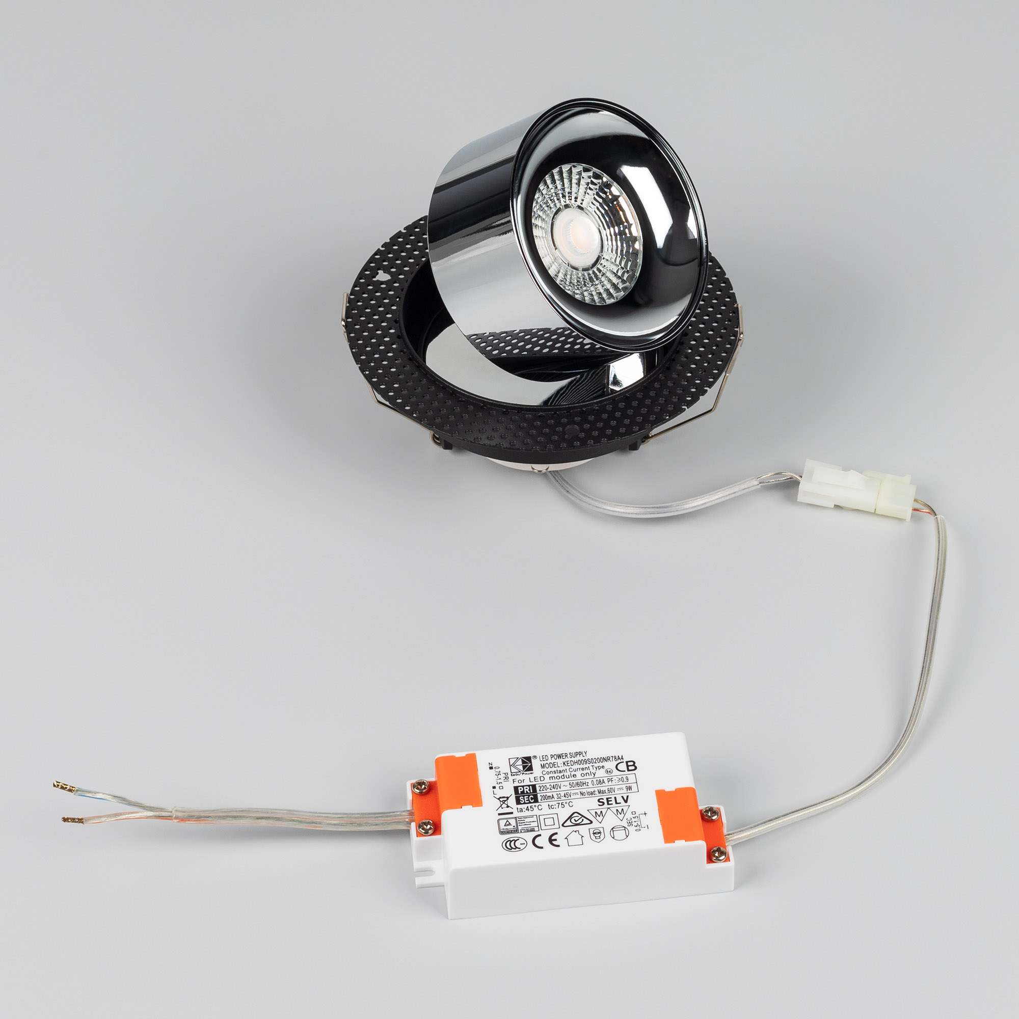 Встраиваемый светильник PLURIO мощностью 9 Вт с высоким индексом цветопередачи и дневным белым цветом свечения (4000 К). Современный светодиодный модуль цвета хром. Световой поток 600 лм и узкий угол излучения 36 градусов идеально подходят для создания акцентного освещения. Низкий коэффициент пульсации гарантирует комфортное и приятное для глаз освещение без мерцания. Возможность поворота вокруг своей оси и наклона светодиодного модуля по вертикали на 90 градусов позволяет быстро отрегулировать направление светового потока в помещении. Благодаря перфорированной поверхности фланца корпуса обеспечивается надежный скрытый монтаж в потолок. С такими встраиваемыми безрамочными светильниками можно сохранить поверхность потолка идеально ровной, превращаясь в единый цельный элемент. Драйвер для подключения к сети 230 В поставляется в комплекте. Возможно управлять яркостью при замене штатного драйвера на диммируемый арт. 047351