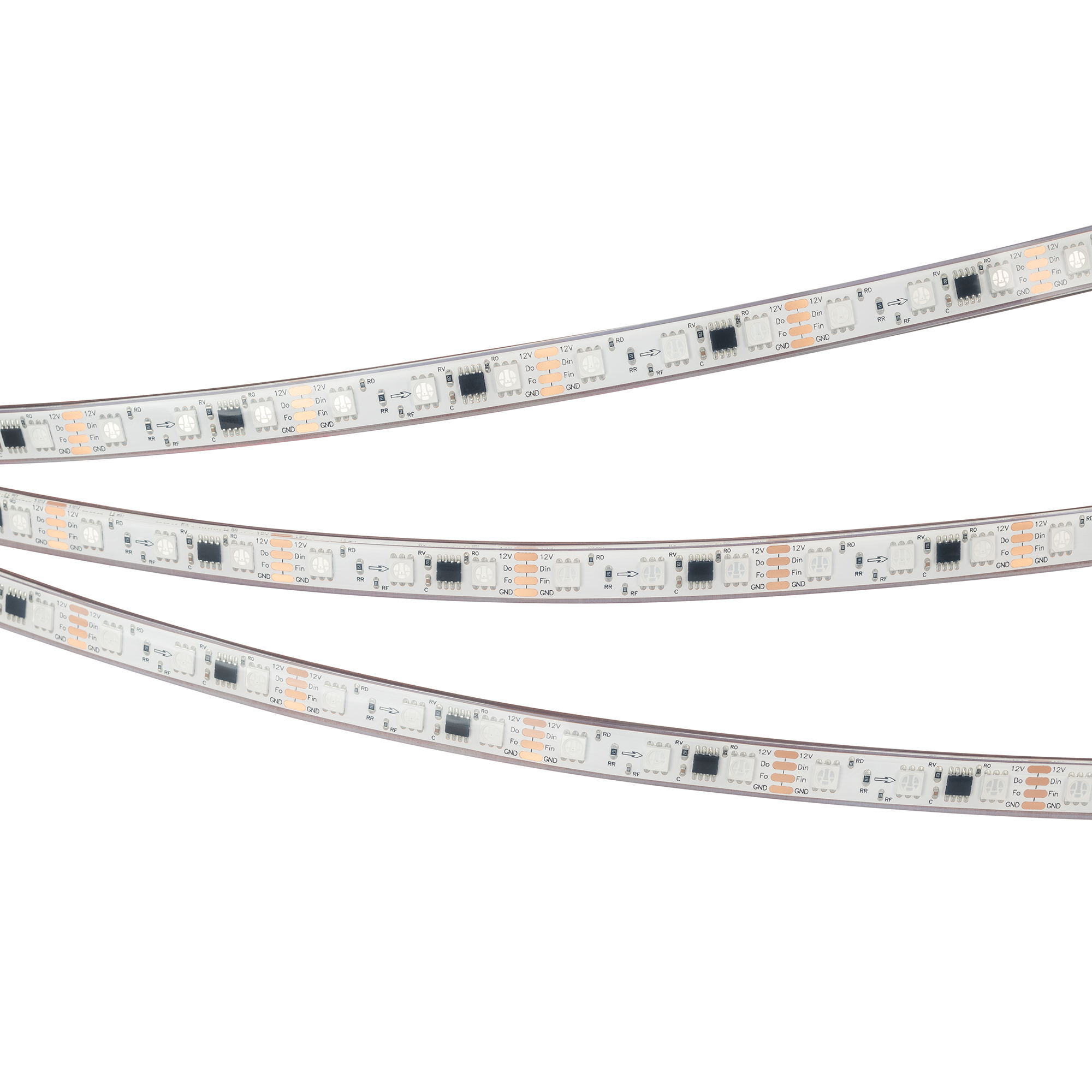 Светодиодная герметичная лента SPI серии B60 с микросхемой MT1808A, IP68 (PFS - полная силиконовая экструзия). Светодиоды SMD 5060, 60 шт/м, 20 pixels на 1 м (100 pixels на 5 м), 1 pixel = 3 светодиода, белая плата шириной 10 мм, скотч 3М. Цвет RGB, угол 120°. Питание 12 В, мощность 12 Вт/м (60 Вт на 5 м). Размеры 5000x12x5 мм. Мин. отрезок 50 мм, 3 светодиода. Цена за 1 м.