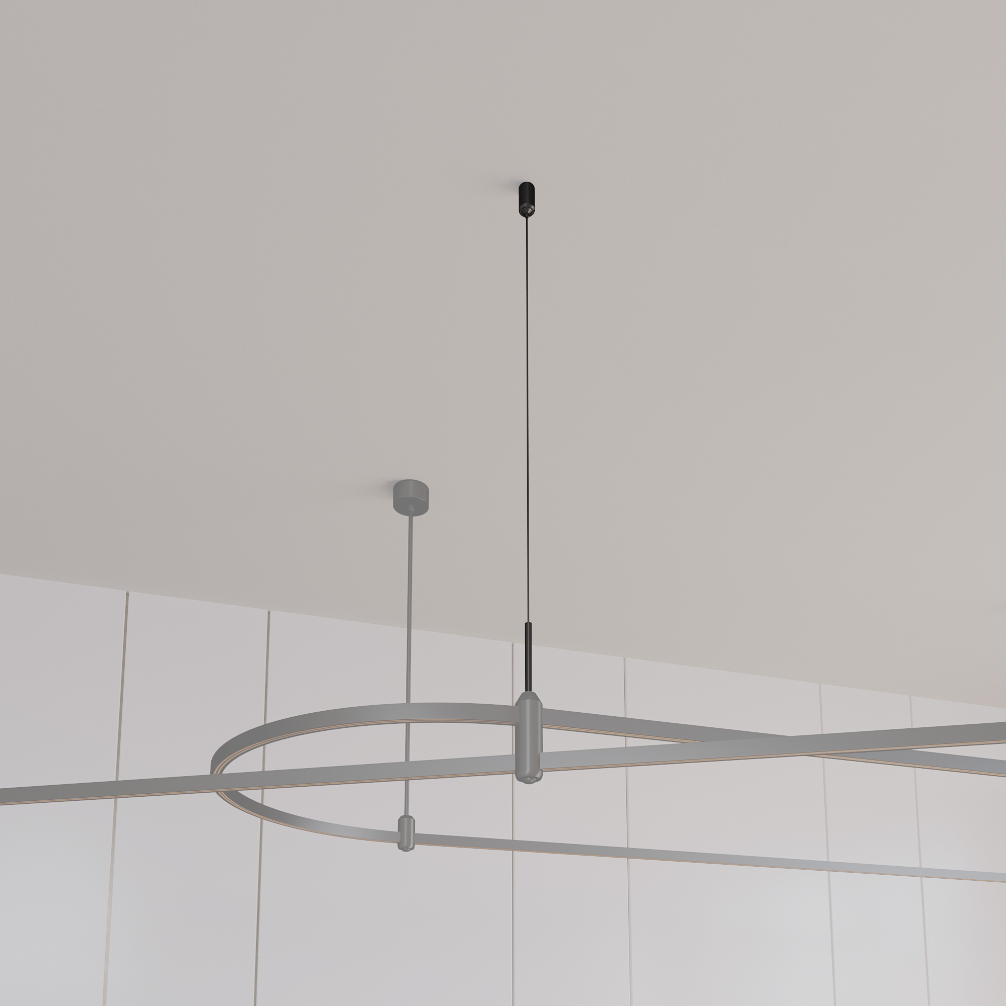 Подвес гибкий HANG-E-L1500 с регулируемым тросом длиной 1500 мм используется для подвесного монтажа треков системы APRIORI к потолку или другой поверхности. Минимальная высота подвеса 125 мм.