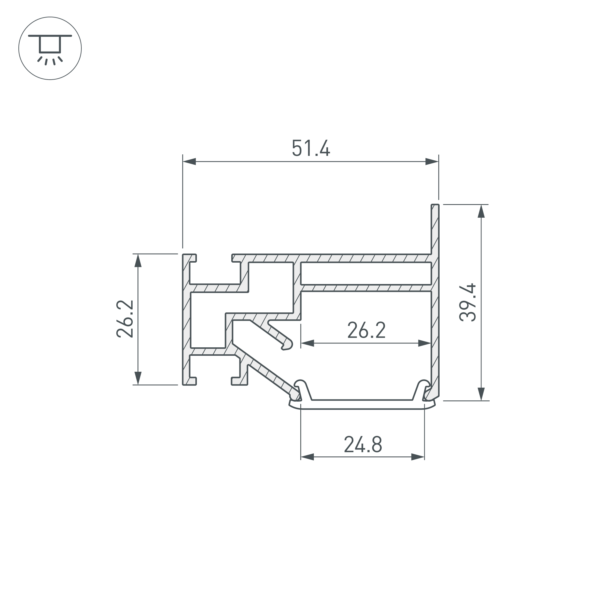 Габаритные размеры профиля составляют 2000 мм в длину, 51,4 мм в ширину и 29,5 мм в высоту. Площадка для установки светодиодных лент позволяет использовать ленту шириной до 26 мм и мощностью до 45 Вт/м. Это обеспечивает гибкость в выборе светодиодных лент и создает потрясающие световые решения.