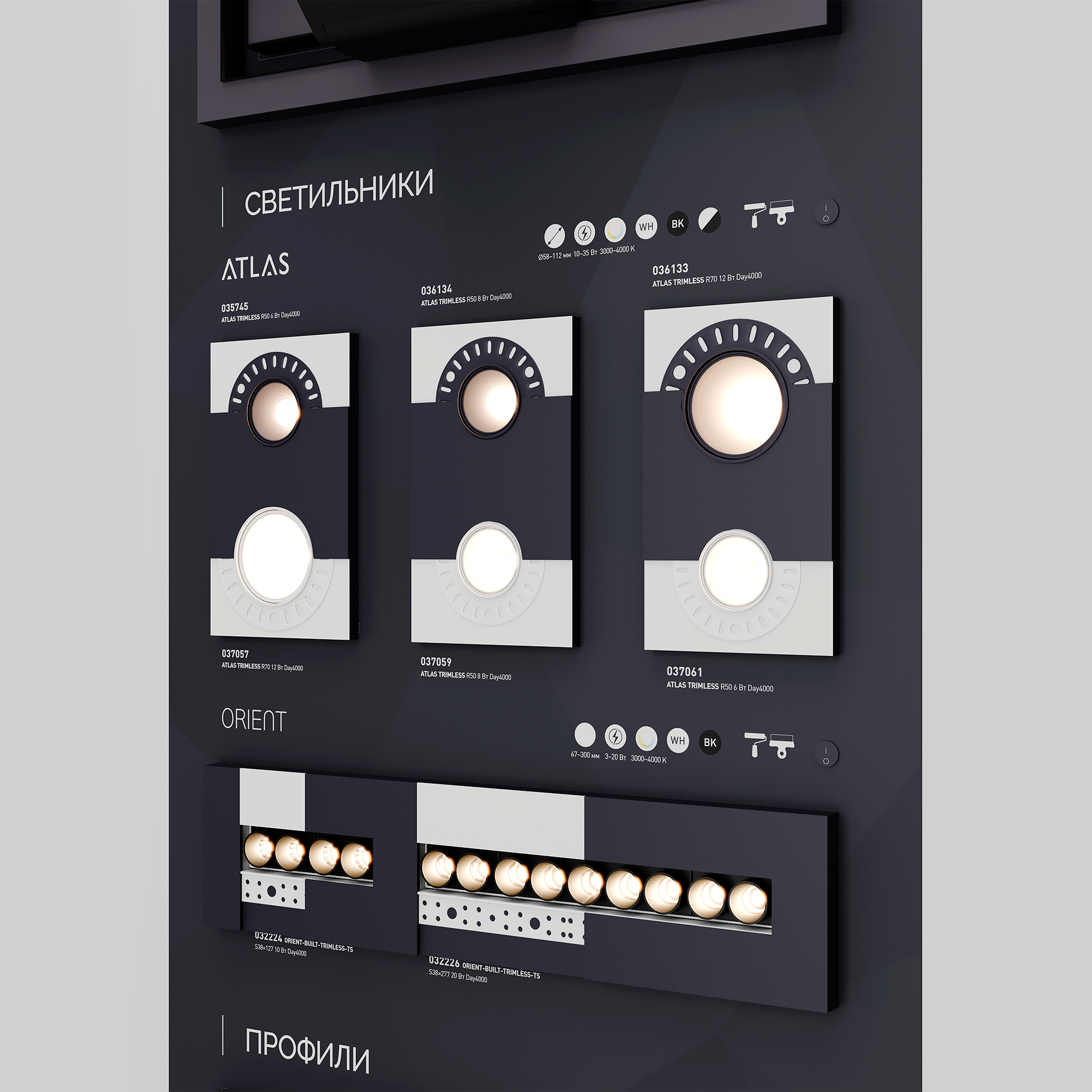 Стенд включает в себя магнитные треки, светильники ATLAS, ORIENT, профили для установки под шпаклевку.