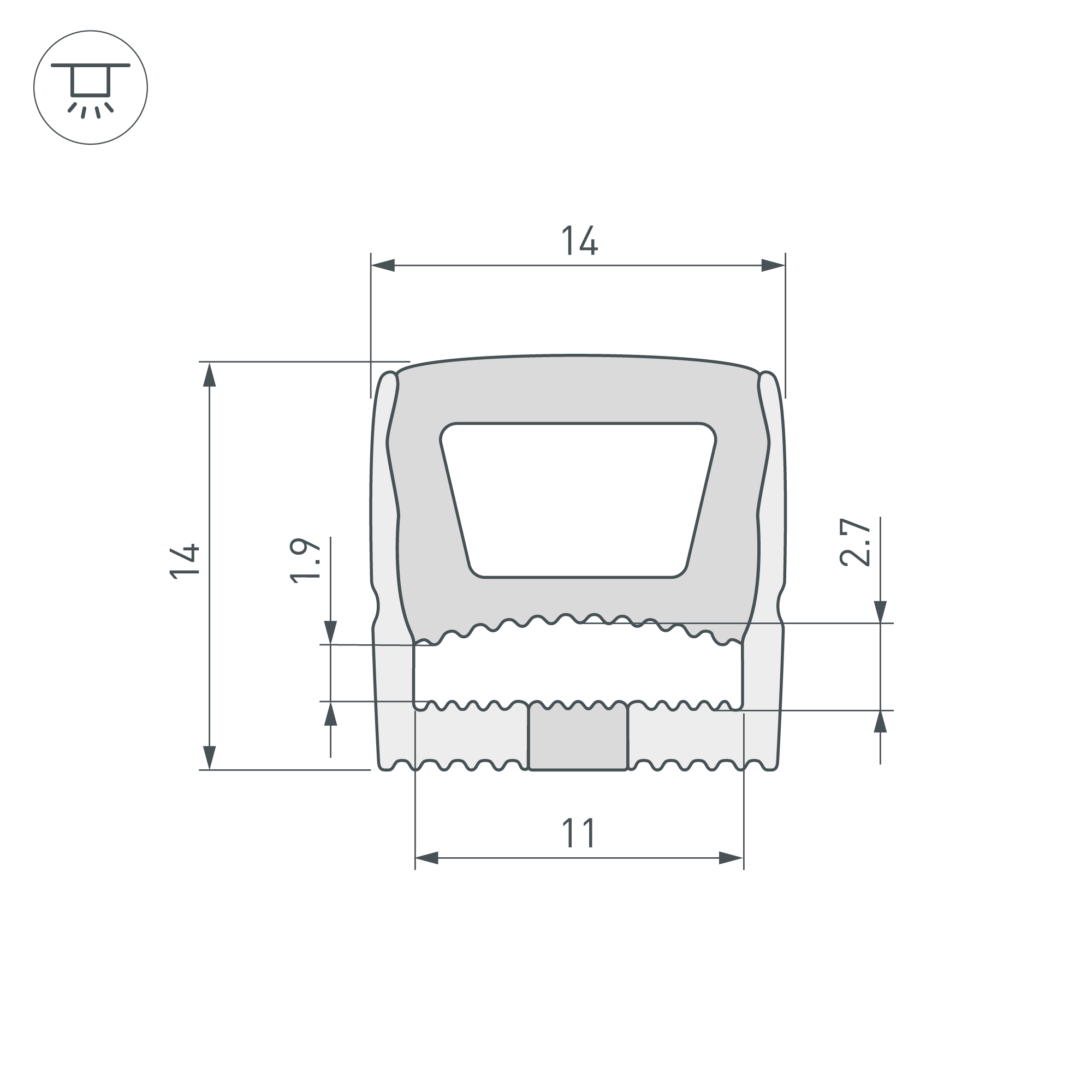 Цельнолитой силиконовый гибкий профиль белого цвета с УФ-защитой. Габаритные размеры профиля составляют 5000 мм в длину, 14 мм в ширину и 14 мм в высоту. Вертикальный изгиб TOP, минимальный радиус изгиба 60 мм. Угол излучения 115°. Для удобства установки ленты по всей длине профиля протянута нить. Площадка для установки светодиодных лент позволяет использовать ленту шириной от 10 до 11 мм, высотой до 2,5 мм и мощностью до 10 Вт/м. Это обеспечивает гибкость в выборе светодиодных лент и создает потрясающие световые решения. Для установки во влажных помещениях необходима герметизация при помощи двухкомпонентного эпоксидного герметика. Класс пылевлагозащиты – IP65 (при соблюдении технологии герметизации). Этот продукт представляет отличное решение для создания современных световых проектов и обеспечивает надежную и стильную основу для установки светодиодов.