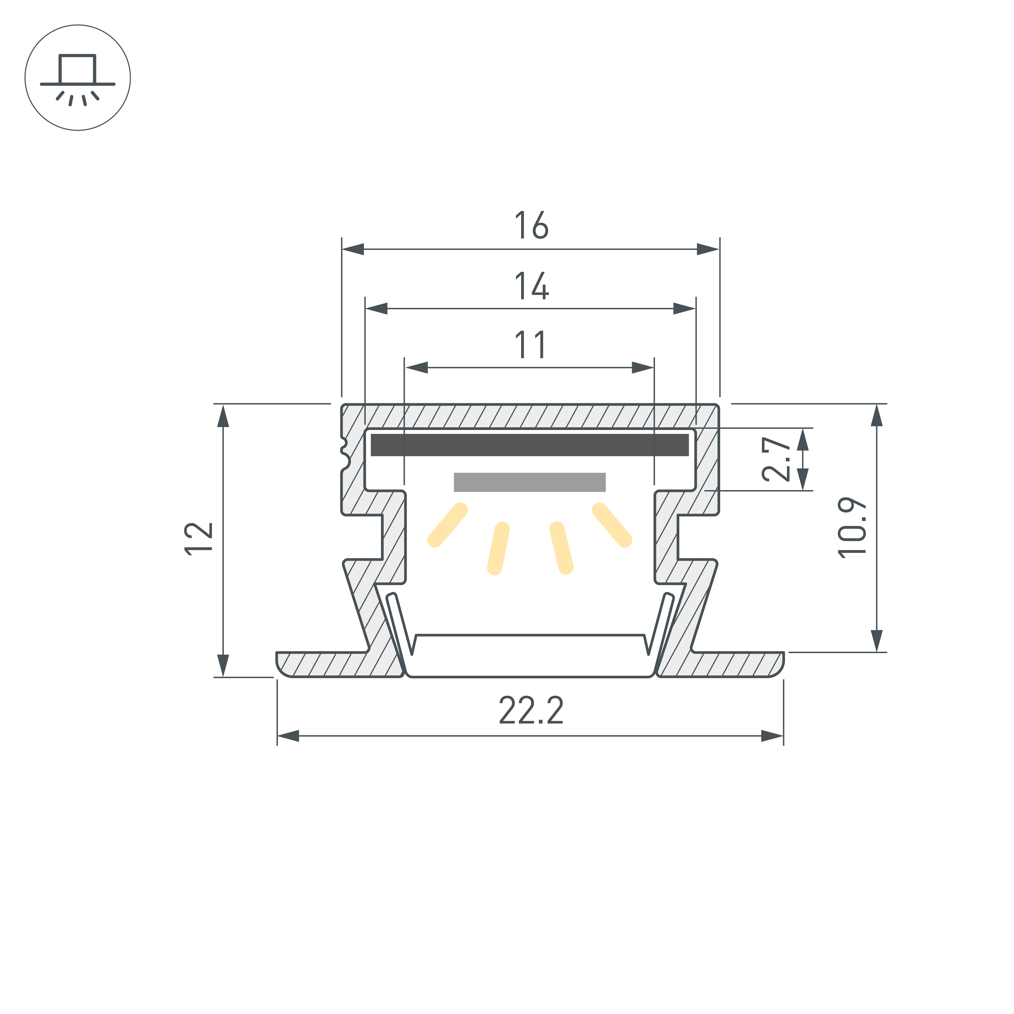 Встраиваемый профиль черного цвета с накладным фланцем из анодированного алюминия для контурной подсветки. Габаритные размеры профиля составляют 2000 мм в длину, 22,2 мм в ширину и 12 мм в высоту. Площадка для установки светодиодных лент позволяет использовать ленту шириной до 14 мм и мощностью до 16,4 Вт/м. Это обеспечивает гибкость в выборе светодиодных лент и создает потрясающие световые решения. Экраны, заглушки и другие аксессуары не включены в комплект и приобретаются отдельно. Цена указана за 1 метр профиля. Отличное решение для создания современных световых проектов.