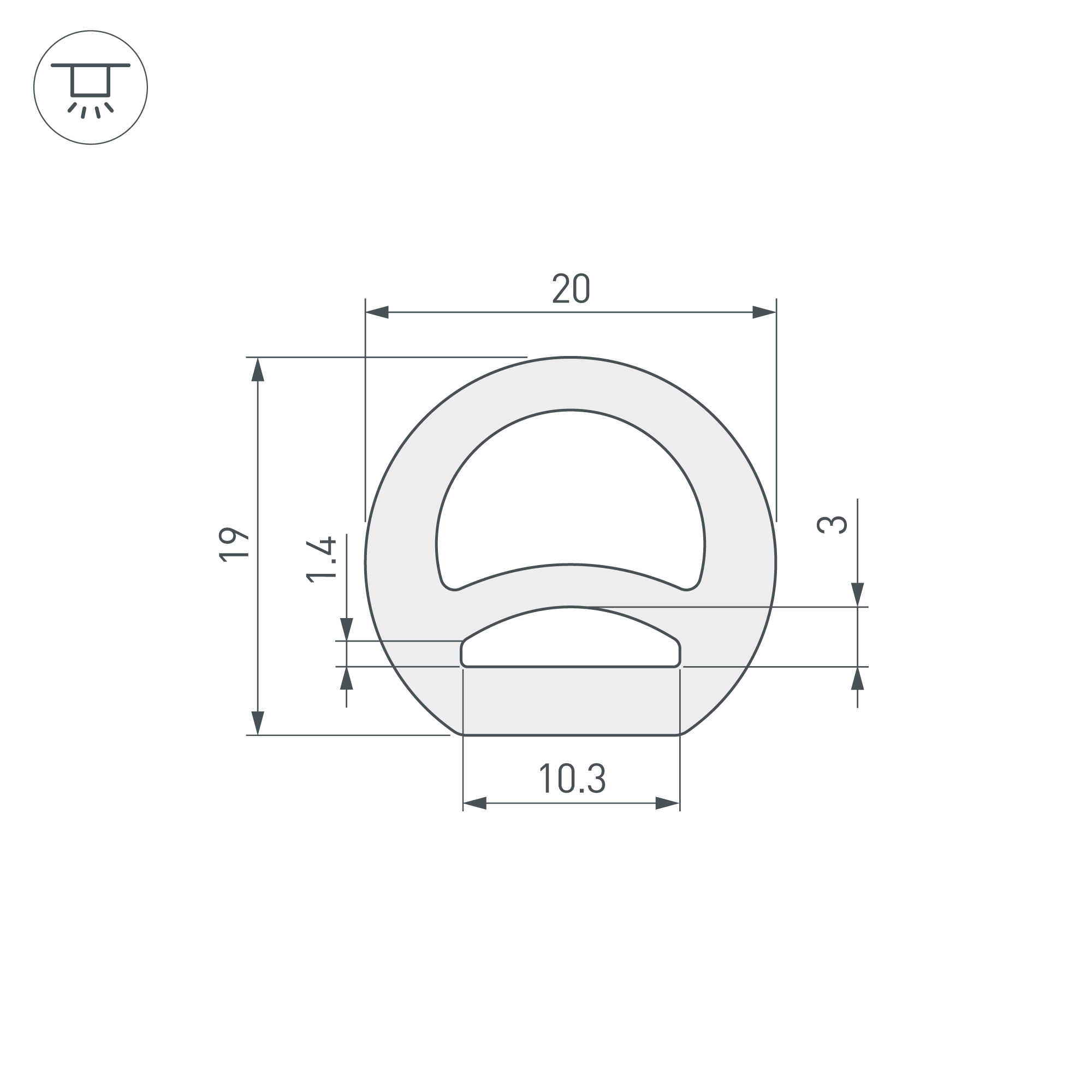 Цельнолитой силиконовый гибкий профиль, белый матовый. Габаритные размеры 50000×20×19 мм. Вертикальный изгиб TOP, минимальный радиус изгиба 60 мм. Для установки во влажных помещениях необходима герметизация при помощи двухкомпонентного эпоксидного герметика. Класс пылевлагозащиты – IP65 (при соблюдении технологии герметизации). Для лент шириной от 8 до 10 мм, высотой до 2,9 мм и мощностью до 10 Вт/м. При подборе ленты необходимо учитывать, что втяжка лент COB, герметичных лент и лент с наличием силиконового слоя может быть затруднена. Угол излучения 110°, поперечный угол излучения 205°. Поставляется в катушках по 50 м. Цена за 1 м. Подходит только для установки внутри помещения.