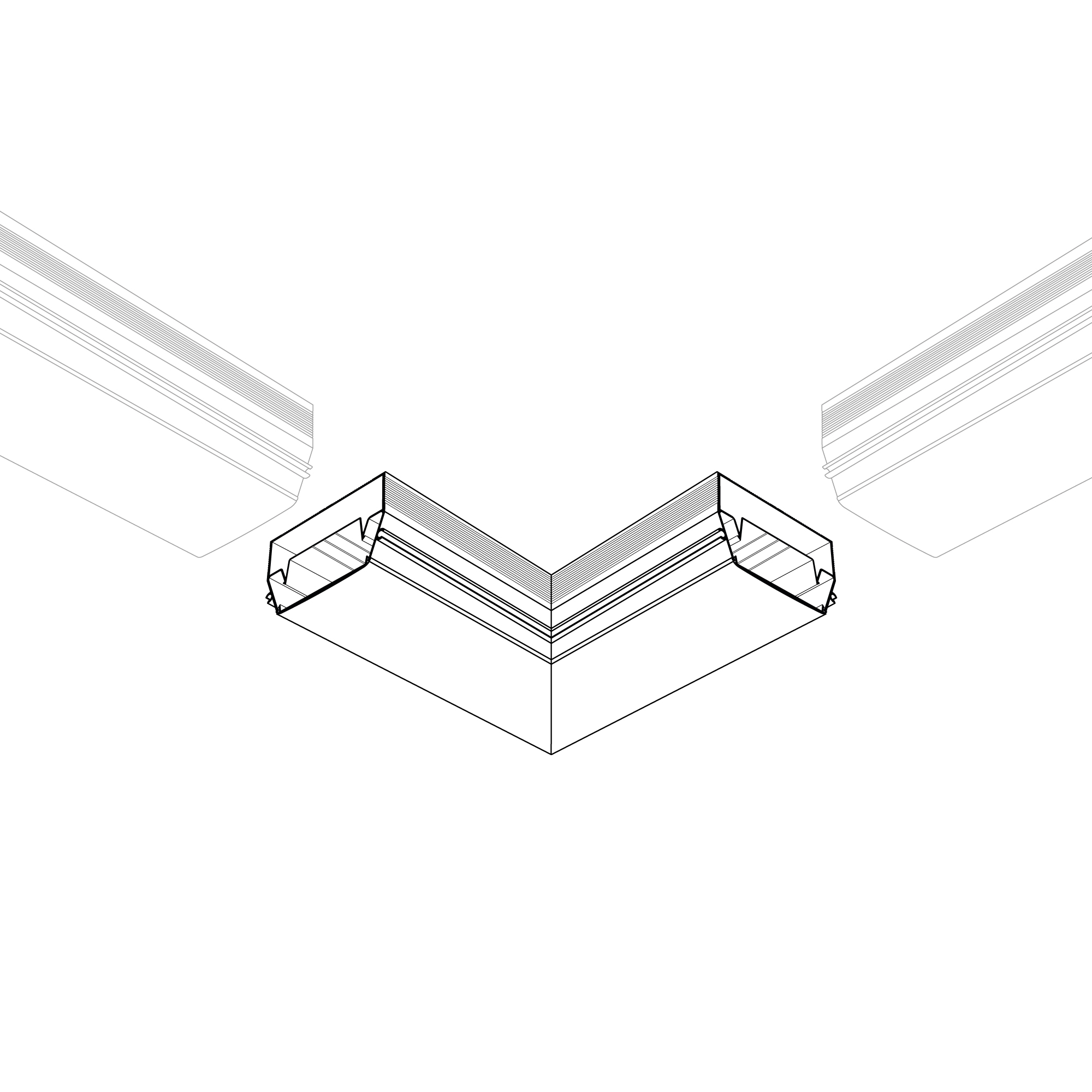 Прямой угол для соединения двух профилей STRETCH-S-50-S-CEIL-CENTER-2000 (GAMMA50) под прямым углом 90° в одной плоскости. Применяется при изготовлении светильников сложной геометрии. Длина внешней стороны угла 150мм.