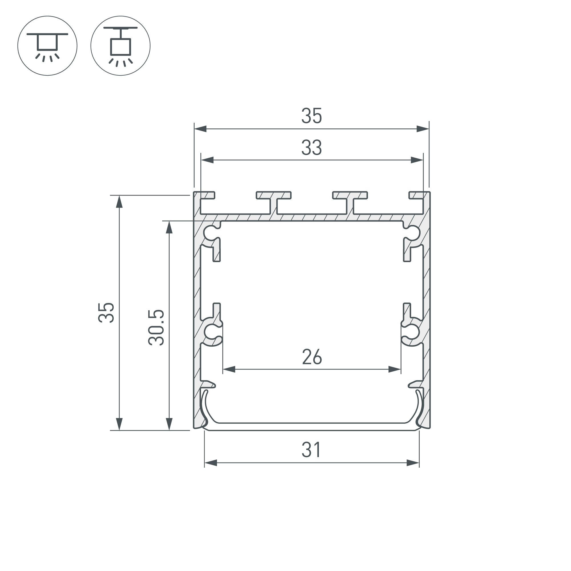 Подвесной/накладной профиль белого цвета из алюминия для основного освещения и контурной подсветки. Габаритные размеры профиля составляют 2500 мм в длину, 35 мм в ширину и 35,5 мм в высоту. Площадка для установки светодиодных лент позволяет использовать ленту шириной до 26 мм и мощностью до 37 Вт/м. Это обеспечивает гибкость в выборе светодиодных лент и создает потрясающие световые решения. Экраны, заглушки и другие аксессуары не включены в комплект и приобретаются отдельно. Цена указана за 1 метр профиля. Отличное решение для создания современных световых проектов. При изготовлении светильников длиной, превышающей длину профиля, соединители необходимо крепить к стенками профиля винтами с минимальным усилием, до первого ощущения сопротивления.