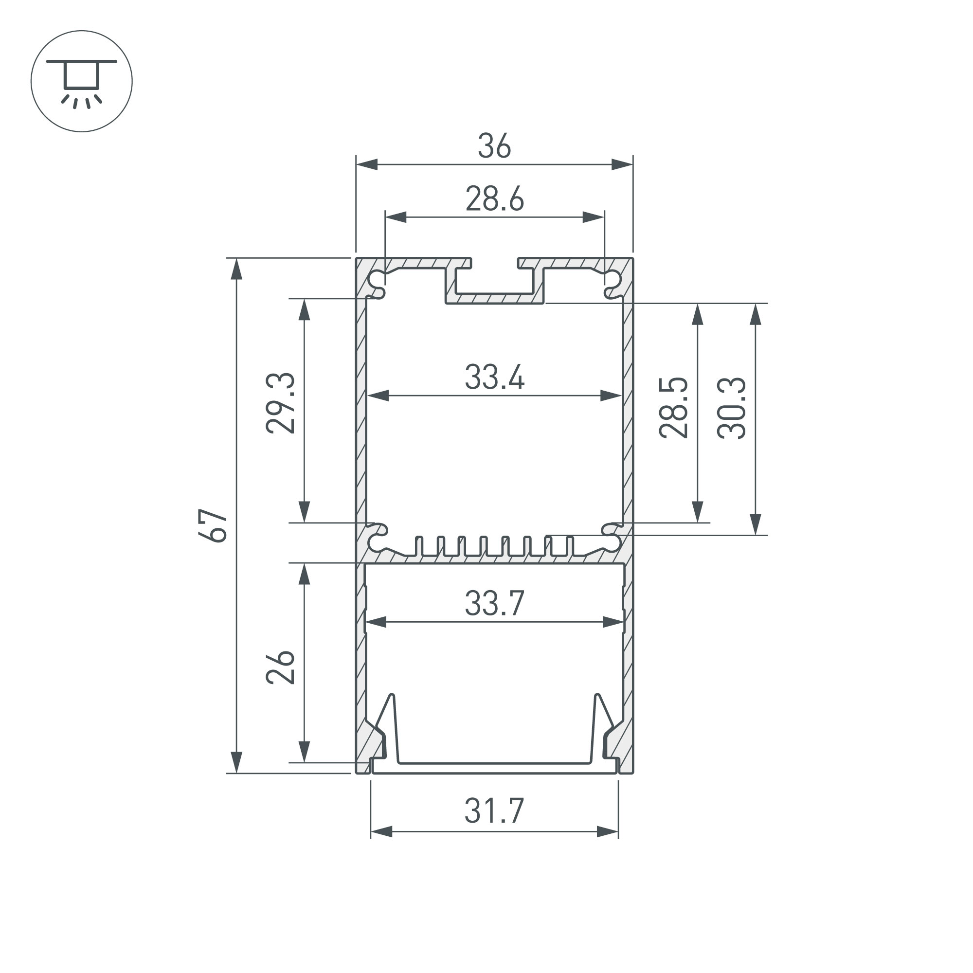Алюминиевый профиль для светодиодных лент и линеек. Цвет - черный RAL9005 (порошковая окраска). Габаритные размеры (L×W×H): 3000x35x67 мм. Ширина площадки для ленты 33 мм. Отсек для БП 32х29мм. Экраны, заглушки и другие аксессуары приобретаются отдельно. Цена за 1 метр.