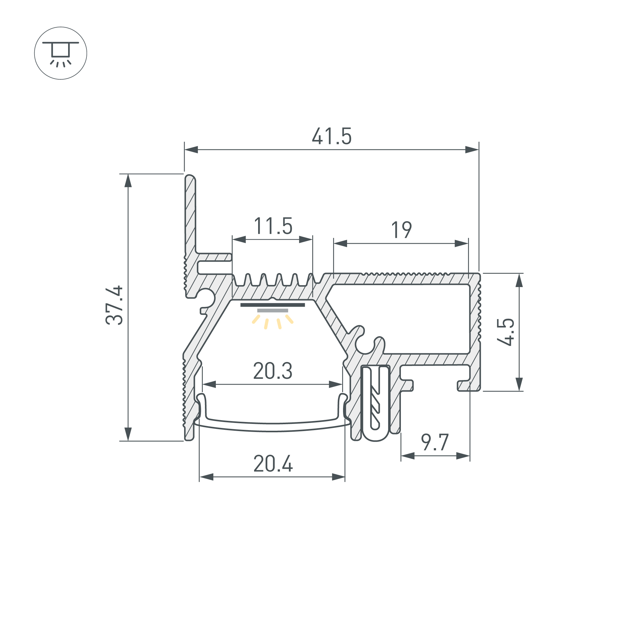Габаритные размеры профиля составляют 2000 мм в длину, 41,5 мм в ширину и 37,4 мм в высоту. Основная площадка для установки светодиодных лент шириной до 11,5 мм и две дополнительные площадки шириной по 10мм. Это обеспечивает гибкость в выборе светодиодных лент и создает потрясающие световые решения.