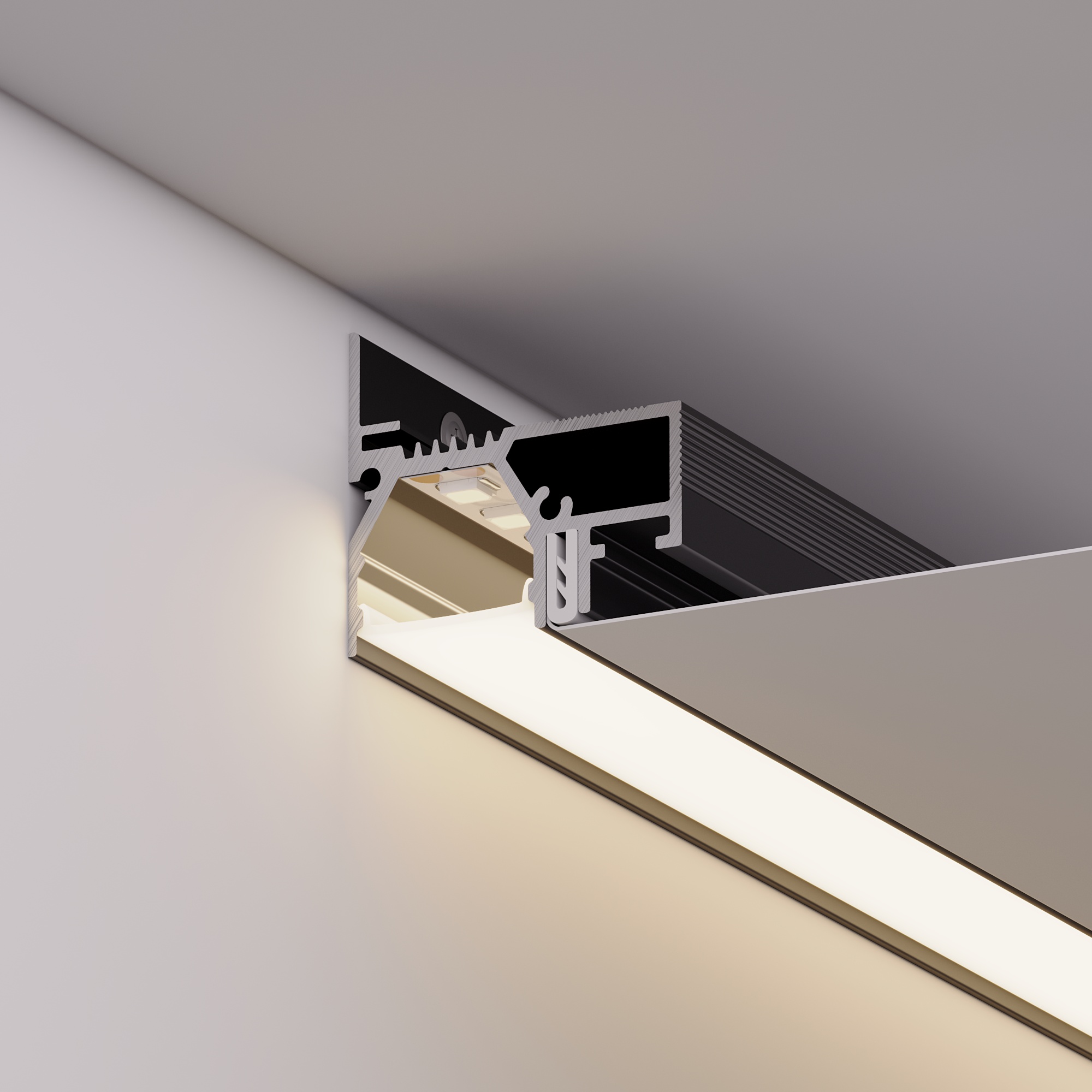 Алюминиевый профиль черного цвета - RAL9005 (порошковая окраска). Боковая линия света в натяжных потолках. Решение 2-в-1: служит каркасом для крепления натяжного потолка и профилем для установки светодиодной ленты. Источник света находится вровень с плоскостью натяжного потолка. Демпферная система крепления полотна натяжного потолка подходит как для тканевых, так и для ПВХ полотен.