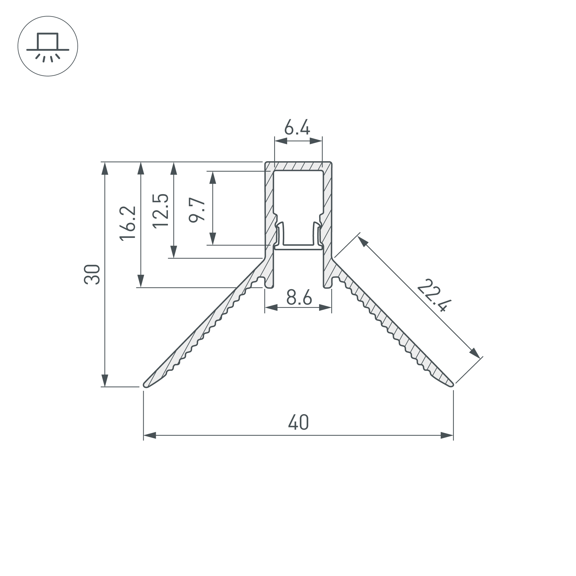 Габаритные размеры этого профиля составляют 2000 мм в длину, 40 мм в ширину и 30 мм в высоту. Площадка для установки светодиодных лент позволяет использовать ленту шириной до 6,4 мм и мощностью до 20 Вт/м. Это обеспечивает гибкость в выборе светодиодных лент и создает потрясающие световые решения.
