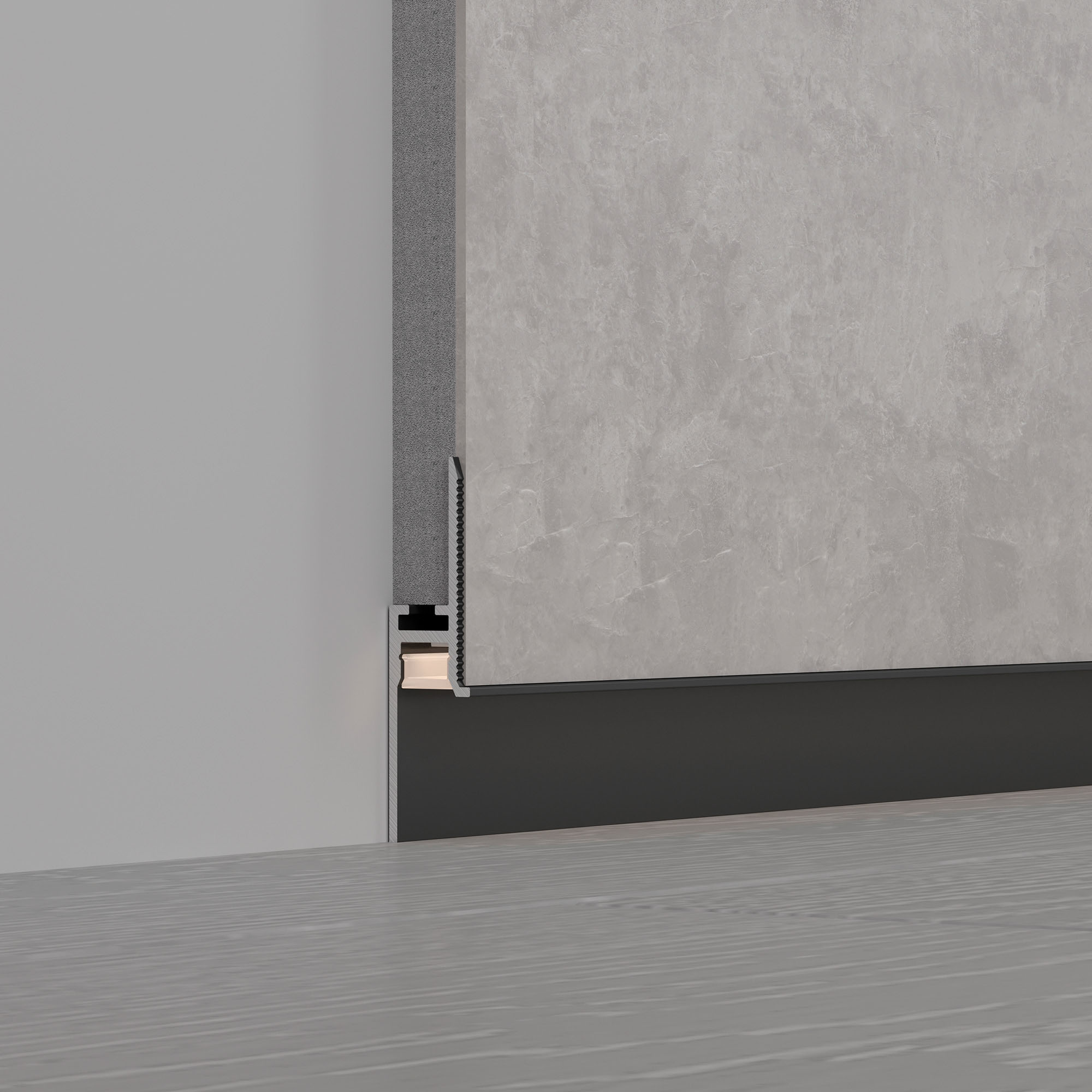 Встраиваемый алюминиевый профиль черного цвета для светодиодных лент и линеек под строительную отделку для создания эффекта парящей стены. Не является плинтусом, используется как декоративная накладка на фальш-стены.