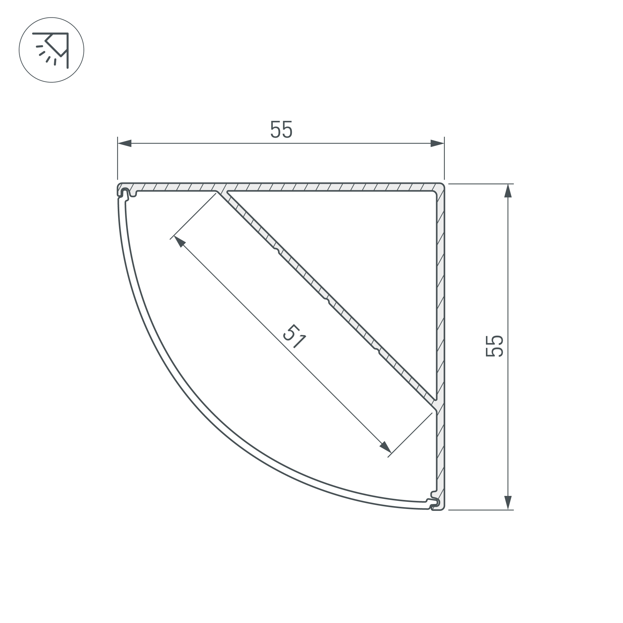 Габаритные размеры профиля составляют 2000 мм в длину, 55 мм в ширину и 55 мм в высоту. Площадка для установки светодиодных лент позволяет использовать ленту шириной до 51 мм и мощностью до 49 Вт/м. Это обеспечивает гибкость в выборе светодиодных лент и создает потрясающие световые решения.