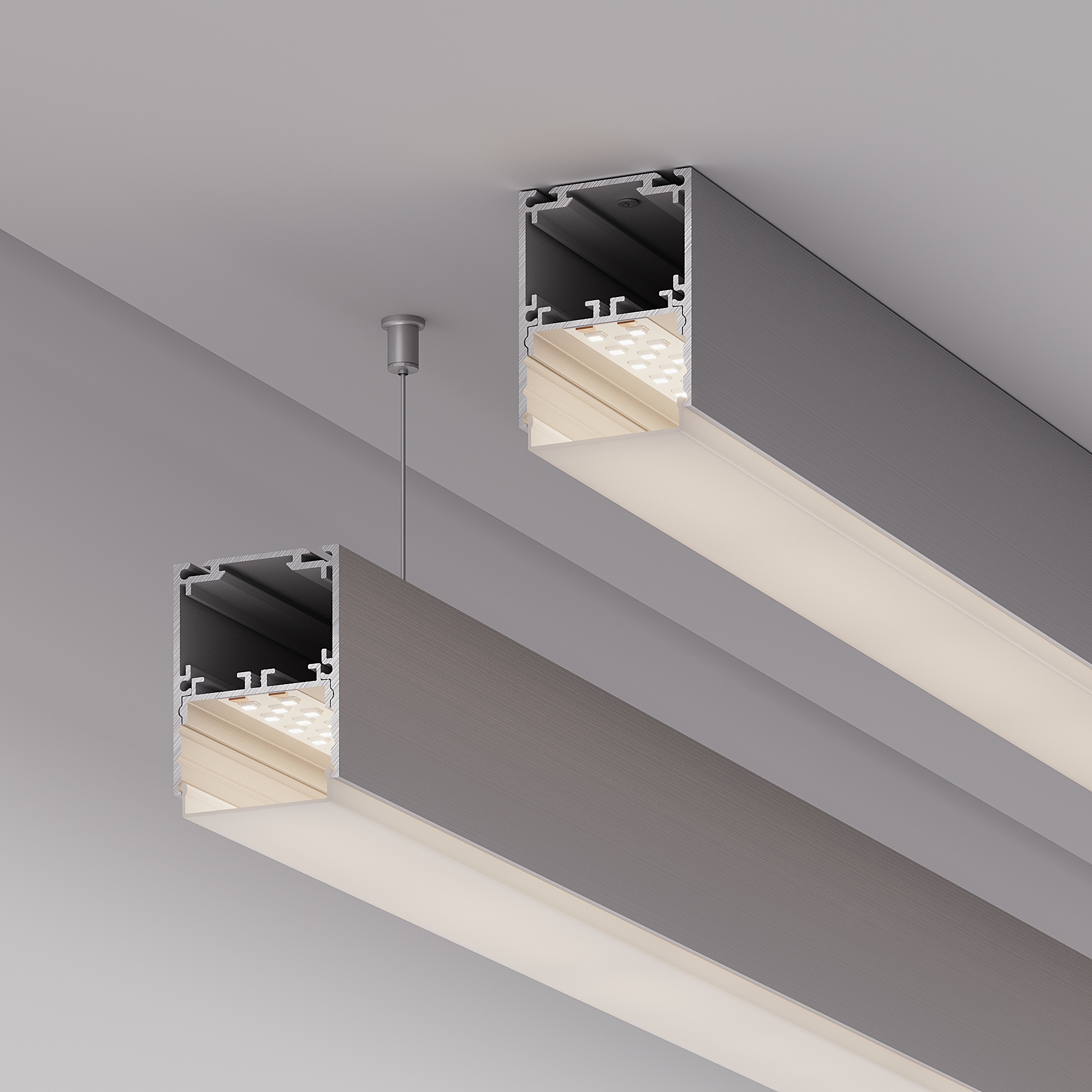 Подвесной/накладной профиль из анодированного алюминия для основного освещения и контурной подсветки. Возможность установки экрана на трех уровнях: выступая за края профиля, вровень с профилем и утоплено, позволяет получить разные световые эффекты.