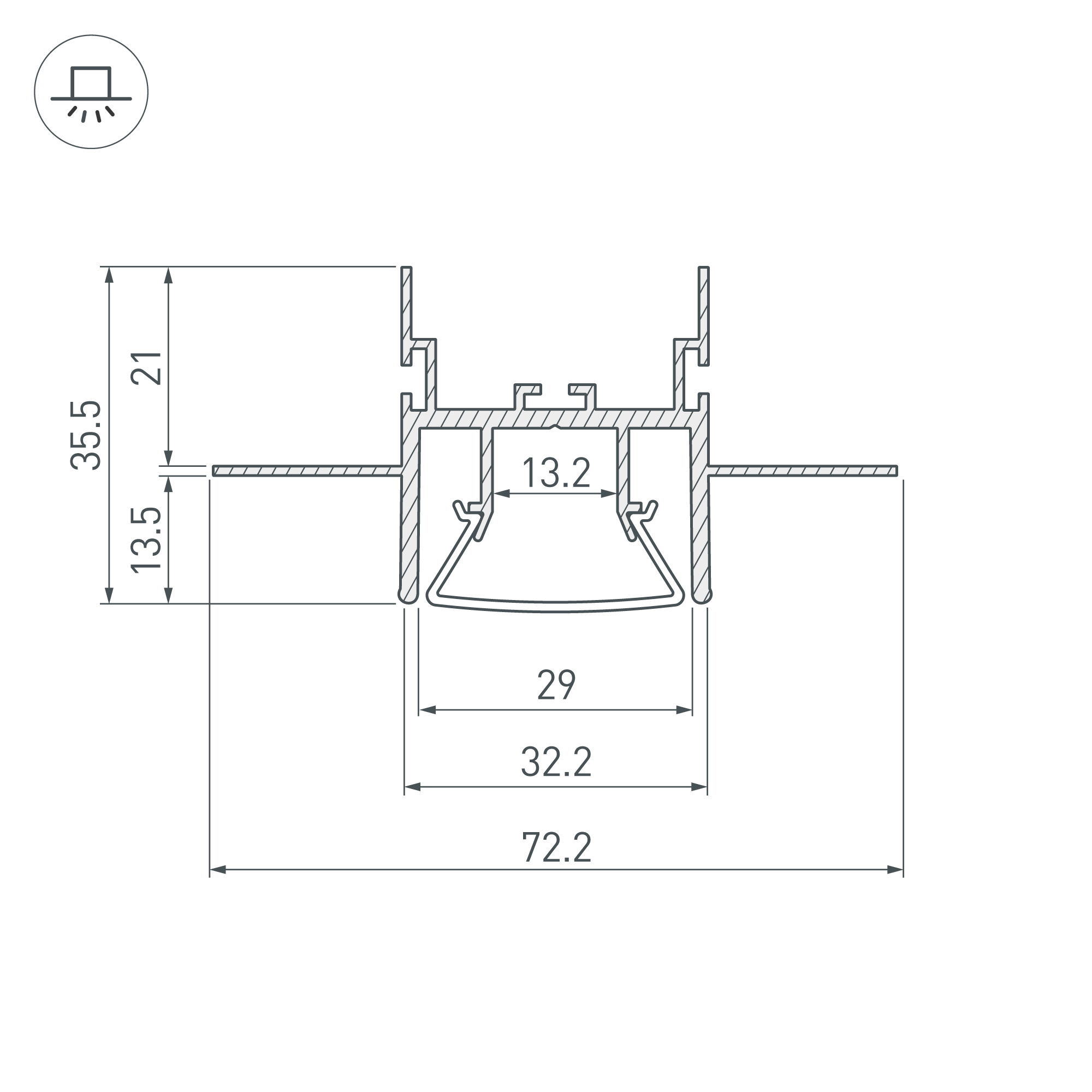 Габаритные размеры профиля составляют 3000 мм в длину, 72,2 мм в ширину и 35,5 мм в высоту. Площадка для установки светодиодных лент позволяет использовать ленту шириной до 13,2 мм и мощностью до 40 Вт/м. Это обеспечивает гибкость в выборе светодиодных лент и создает потрясающие световые решения.
