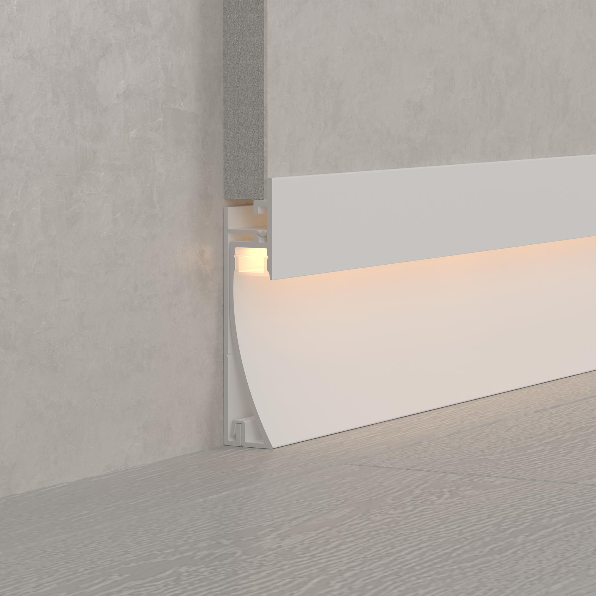 Встраиваемый двухкомпонентный алюминиевый профиль-плинтус с накладным фланцем белого цвета для создания эффекта парящей стены.