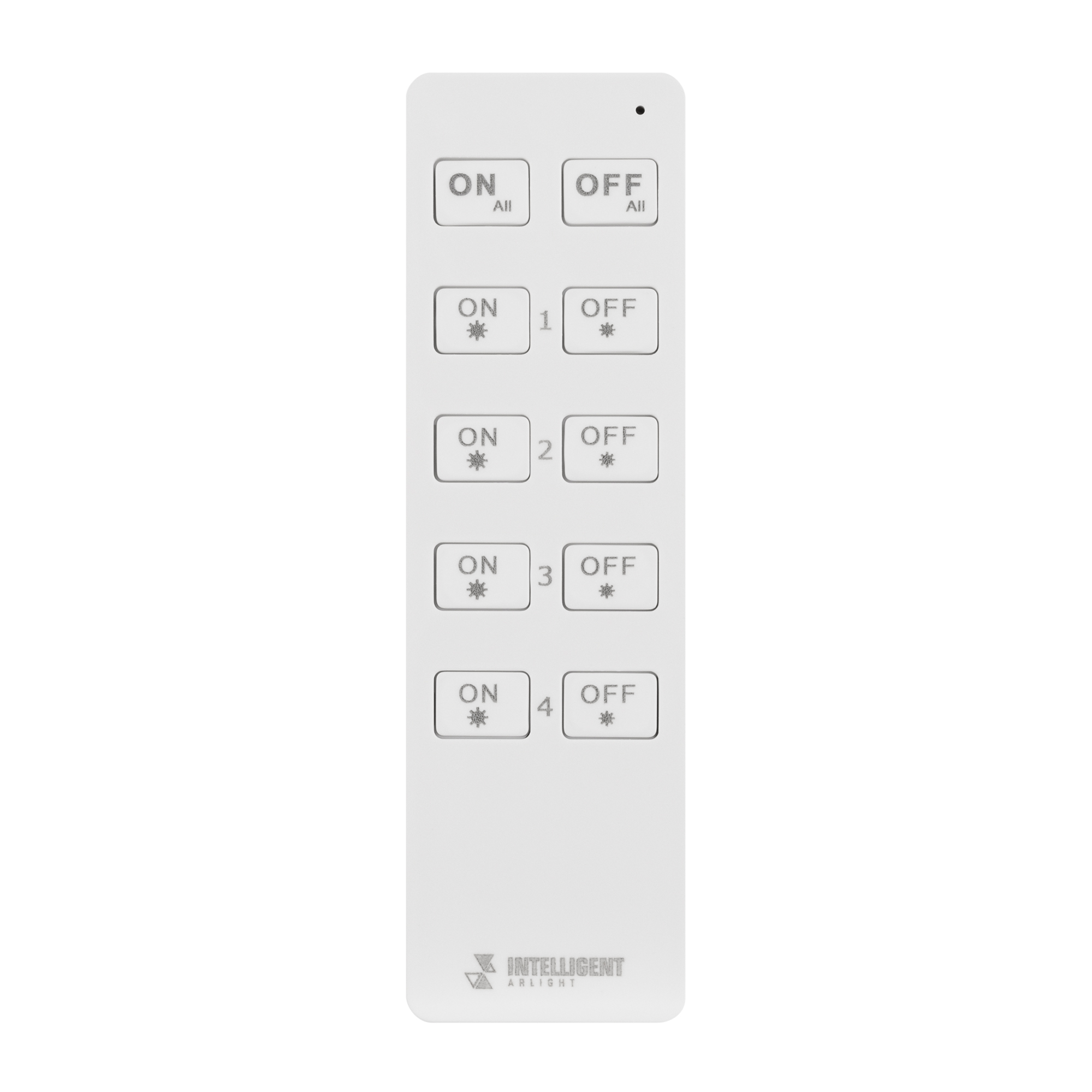 Кнопочный радиочастотный пульт белого цвета, предназначенный для управления одноцветными источниками света. Поддерживает основные функции: включение и выключение света, регулировку яркости, управление 4 световыми зонами. Устройство совместимо с диммерами и контроллерами серии SMART, поддерживающими управление по радиоканалу 2.4G. К одному пульту возможно привязать неограниченное количество диммеров и контроллеров. Питание 3В осуществляется от батарейки CR2032. Корпус пульта выполнен из пластика с покрытием Soft-Touch. Габариты устройства 135x40x11 мм. В комплекте настенный держатель с крепежными элементами.
