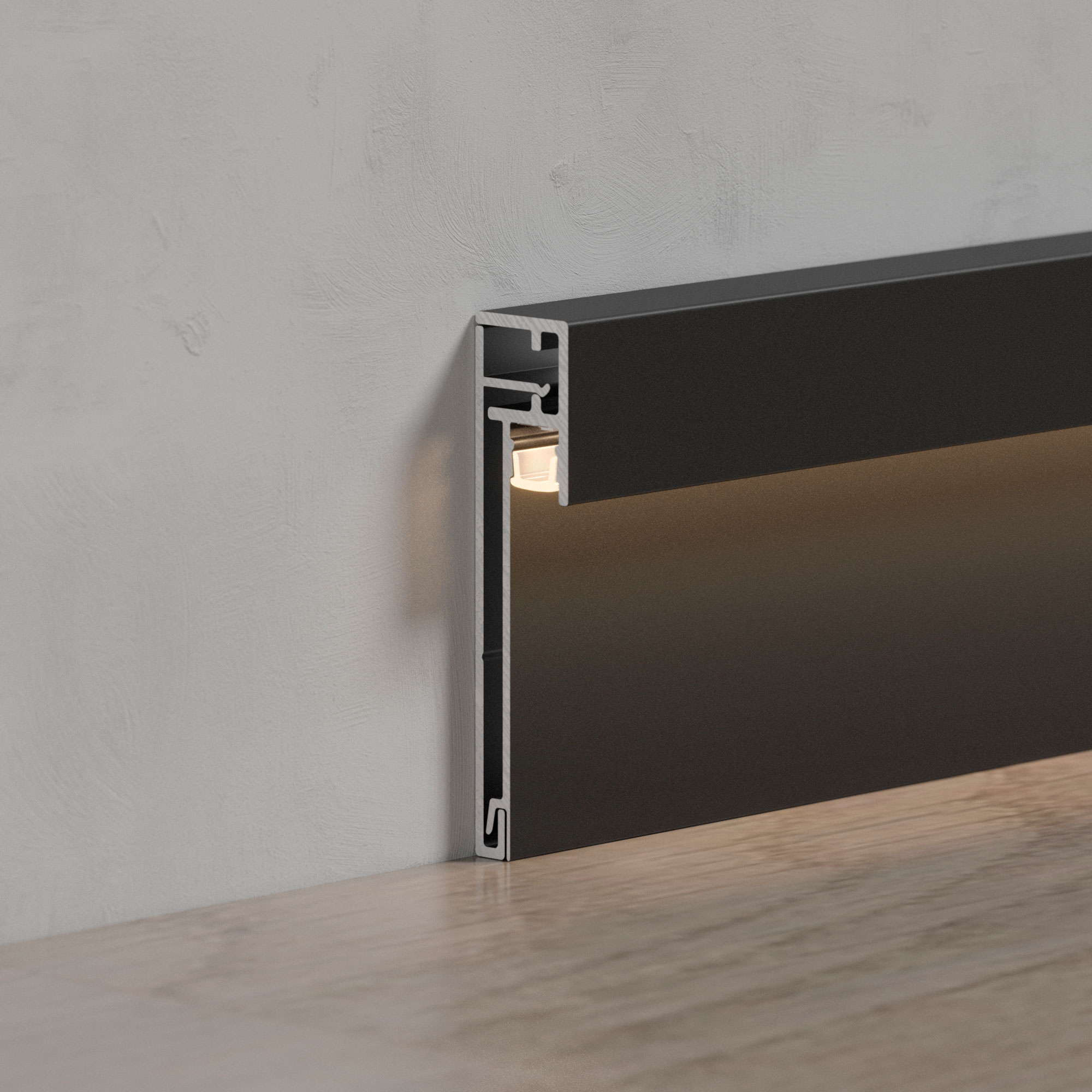 Накладной двухкомпонентный алюминиевый профиль-плинтус черного цвета для контурной подсветки помещения. Габаритные размеры профиля составляют 2000 мм в длину, 12,3 мм в ширину и 52,6 мм в высоту. Площадка для установки светодиодных лент позволяет использовать ленту шириной до 5 мм и мощностью до 20 Вт/м. Это обеспечивает гибкость в выборе светодиодных лент и создает потрясающие световые решения.