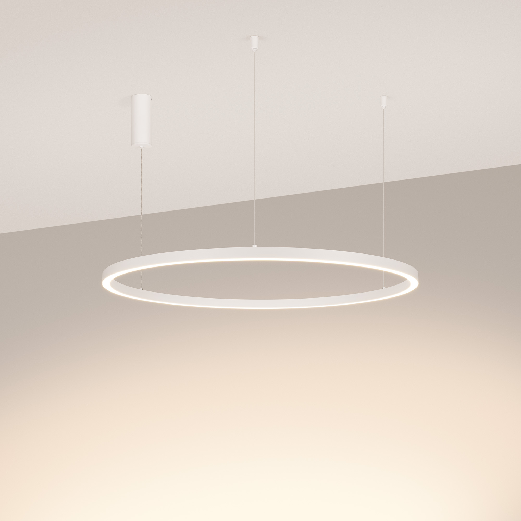 Подвесной светильник. Мощность 42 Вт, св. поток 2520 лм, 60 лм/Вт, теплый 3000 K, CRI>90, угол 120°, напряжение питания 230 В. Белый круглый корпус из алюминия, экран силикон, степень защиты IP20. Размер: диаметр 800 мм, высота 25 мм, ширина профиля 25 мм, размер чаши: диаметр 60 мм, высота 150 мм. Питание AC220-240В, 42Вт. Драйвер:115 x 40 x 28 мм, 33-40В, 1050 мА. Пульсация <5%. Монтаж подвесной, длина подвеса 1200мм.