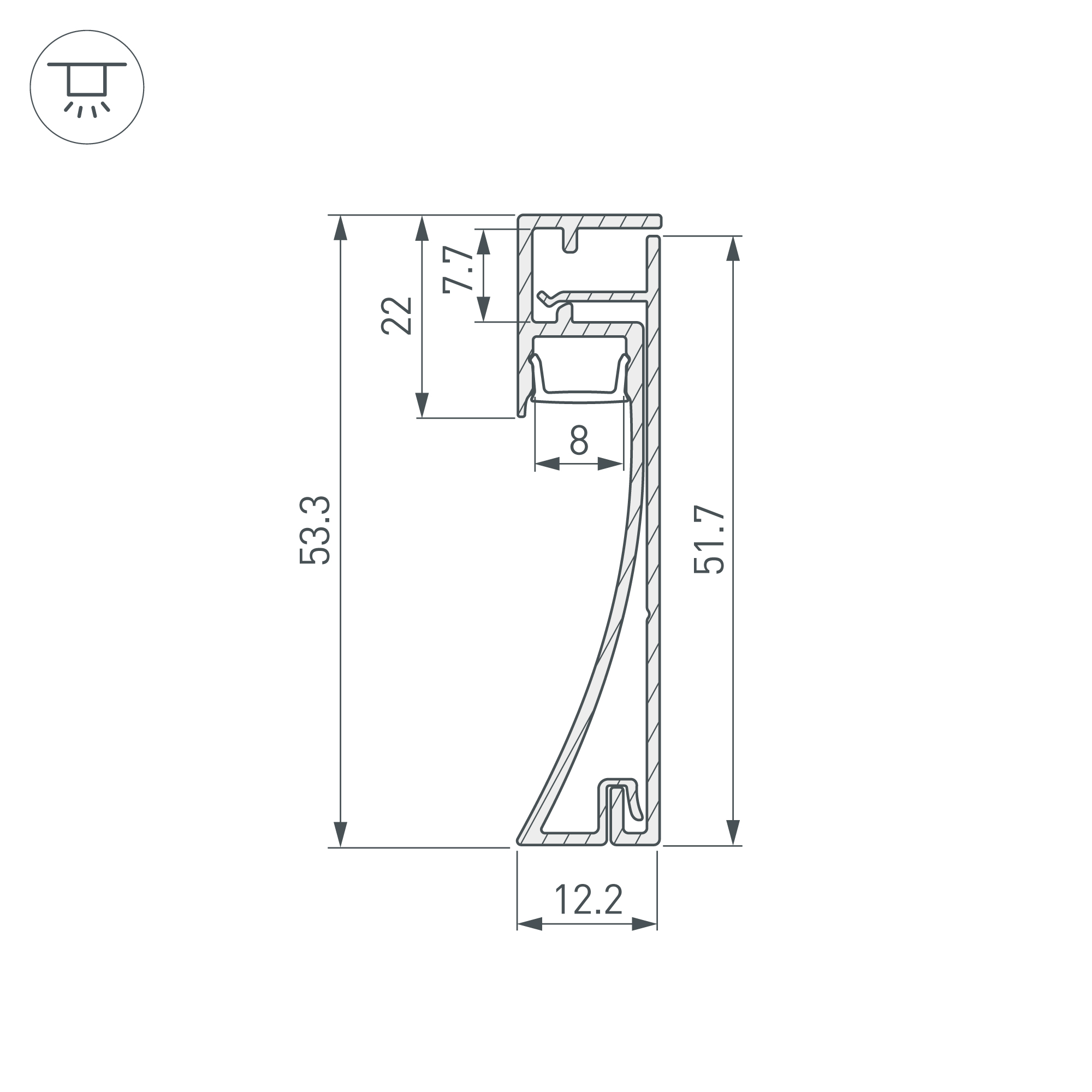 Накладной двухкомпонентный профиль-плинтус из анодированного алюминия для контурной подсветки помещения. Габаритные размеры профиля составляют 2000 мм в длину, 12,2 мм в ширину и 53,3 мм в высоту. Площадка для установки светодиодных лент позволяет использовать ленту шириной до 8 мм и мощностью до 20 Вт/м. Это обеспечивает гибкость в выборе светодиодных лент и создает потрясающие световые решения.