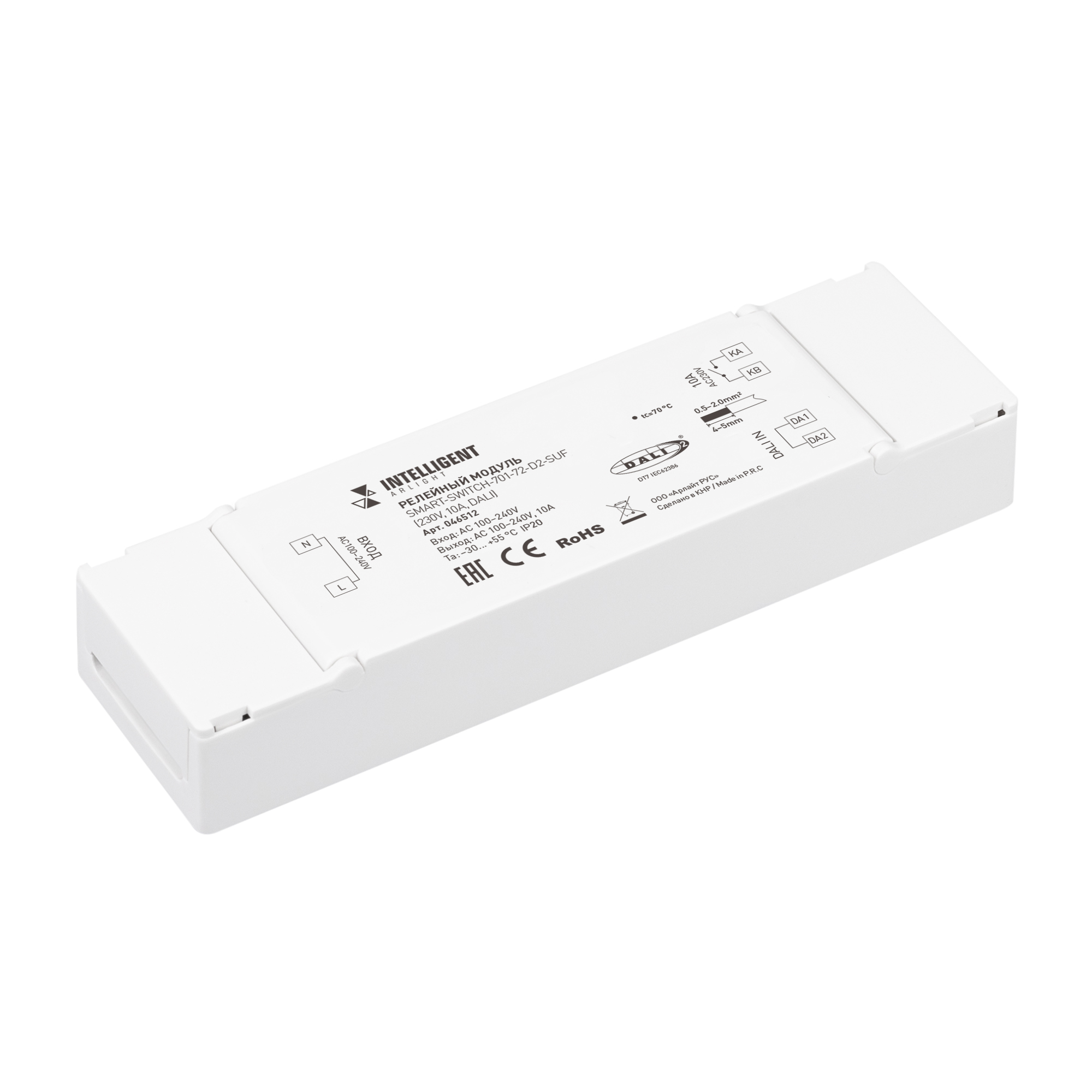 Одноканальный релейный модуль, предназначенный для включения и выключения источников света напряжением питания 230В с максимальным выходным током 10А на канал. Устройство совместимо с панелями управления с выходом DALI и контроллерами DALI.Управляется внешним сигналом с использованием цифрового интерфейса DALI. Назначение адреса выполняется мастер-контроллером по шине DALI. Корпус белого цвета. Размеры 140×38×20,5 мм.