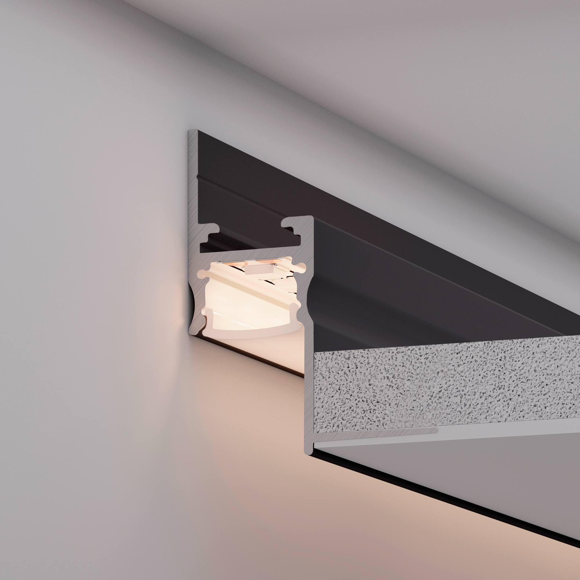 Встраиваемый алюминиевый профиль чёрного цвета со скрытым фланцем устанавливается в потолки и потолочные ниши из гипсокартона, образуя теневой зазор между потолком и стеной. Такое решение создает визуальный эффект потолка, парящего в воздухе с мягким свечением по периметру комнаты.