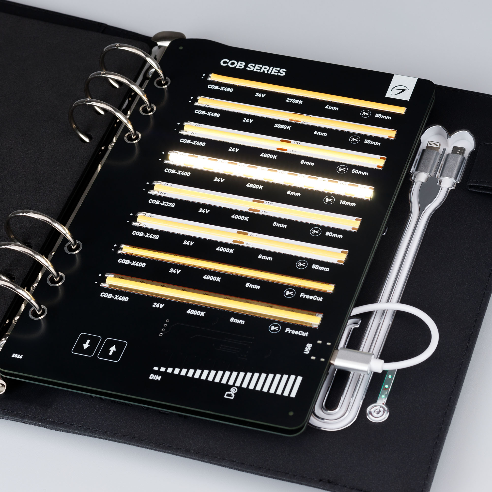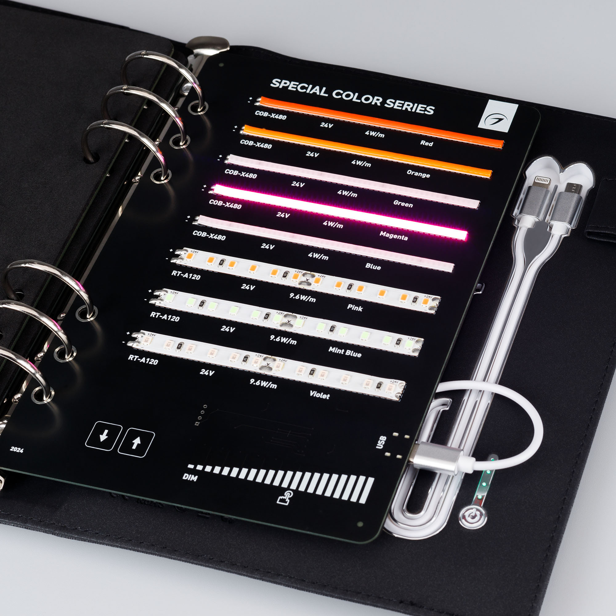 Демонстрационный набор светодиодных лент ARLIGHT. В кейс входят 45 образцов моделей лент COB, RT, MICROLED, MIX, SPI. Демокейс работает от Power Bank (8000 mAh). в комплекте 3 разъема для подключения и 1 разъем для зарядки.
