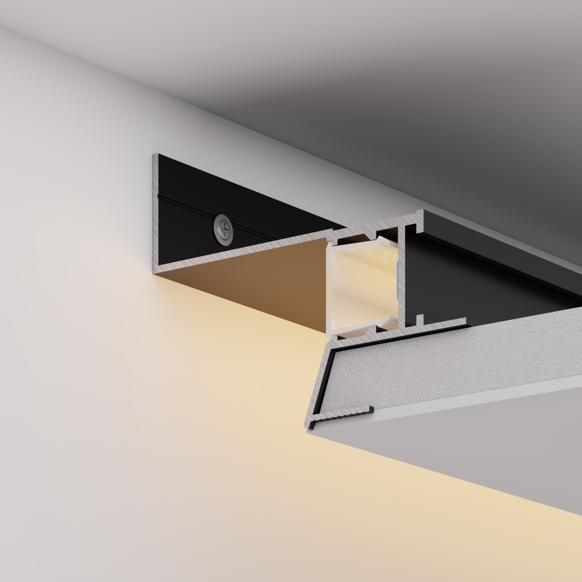 Профиль для создания эффекта парящего потолка с мягким свечением по периметру помещения. Ширина зазор между потолком и стеной 39,2 мм делает его идеальным решением для коммерческих объектов и помещений с высокими потолками. Встраиваемый алюминиевый профиль черного цвета RAL9005 (порошковая окраска) со скрытым фланцем устанавливается в потолки и потолочные ниши из гипсокартона толщиной 12,5 мм.