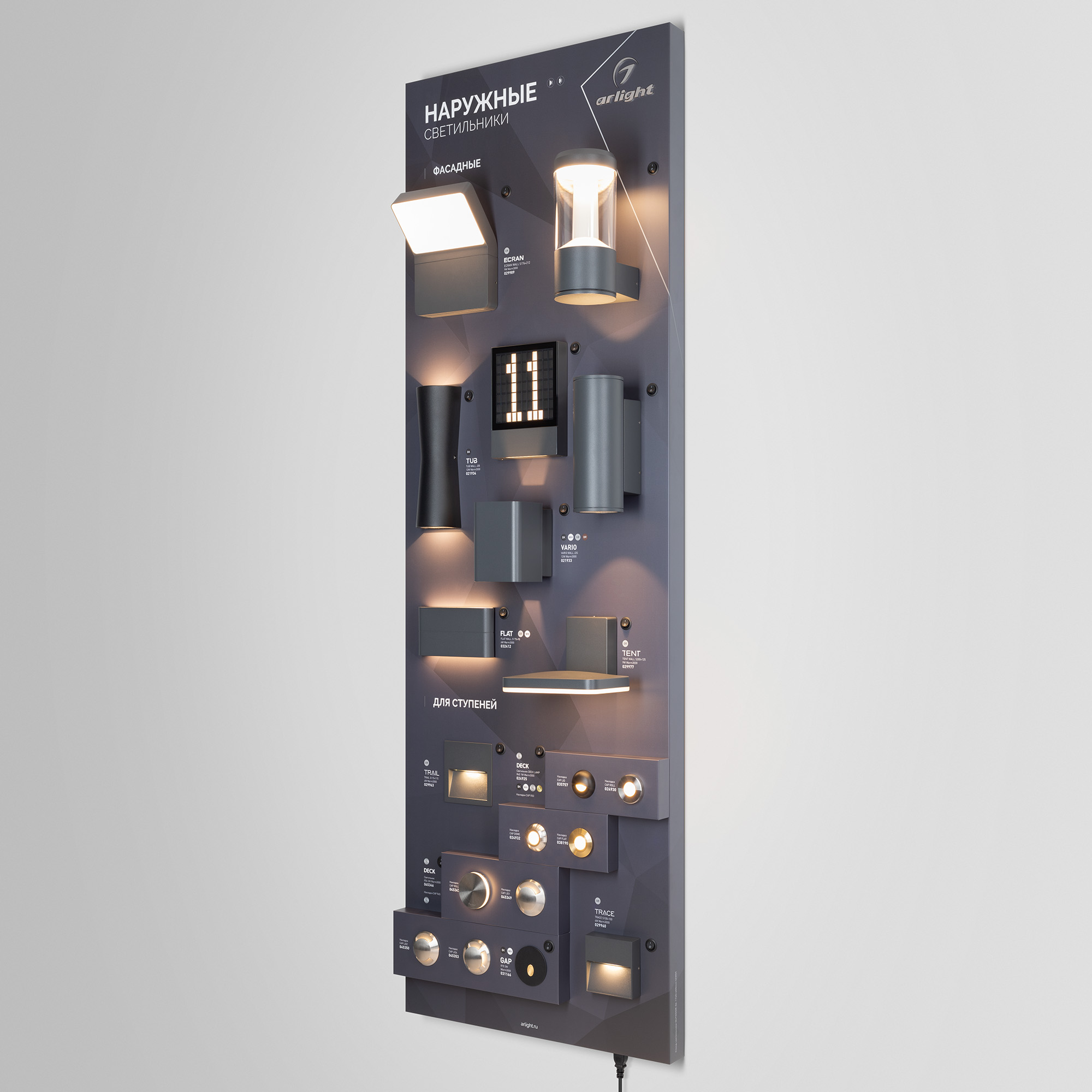 Стенд НАРУЖНОЕ ОСВЕЩЕНИЕ. Фасадное освещение и подсветка для ступеней. На стенде представлены светильники серий SIGN, STEM, ECRAN, TUB, FORMA, VARIO, WALL FLAT, TENT,TRAIL, DECK, TRACE, GAP.
