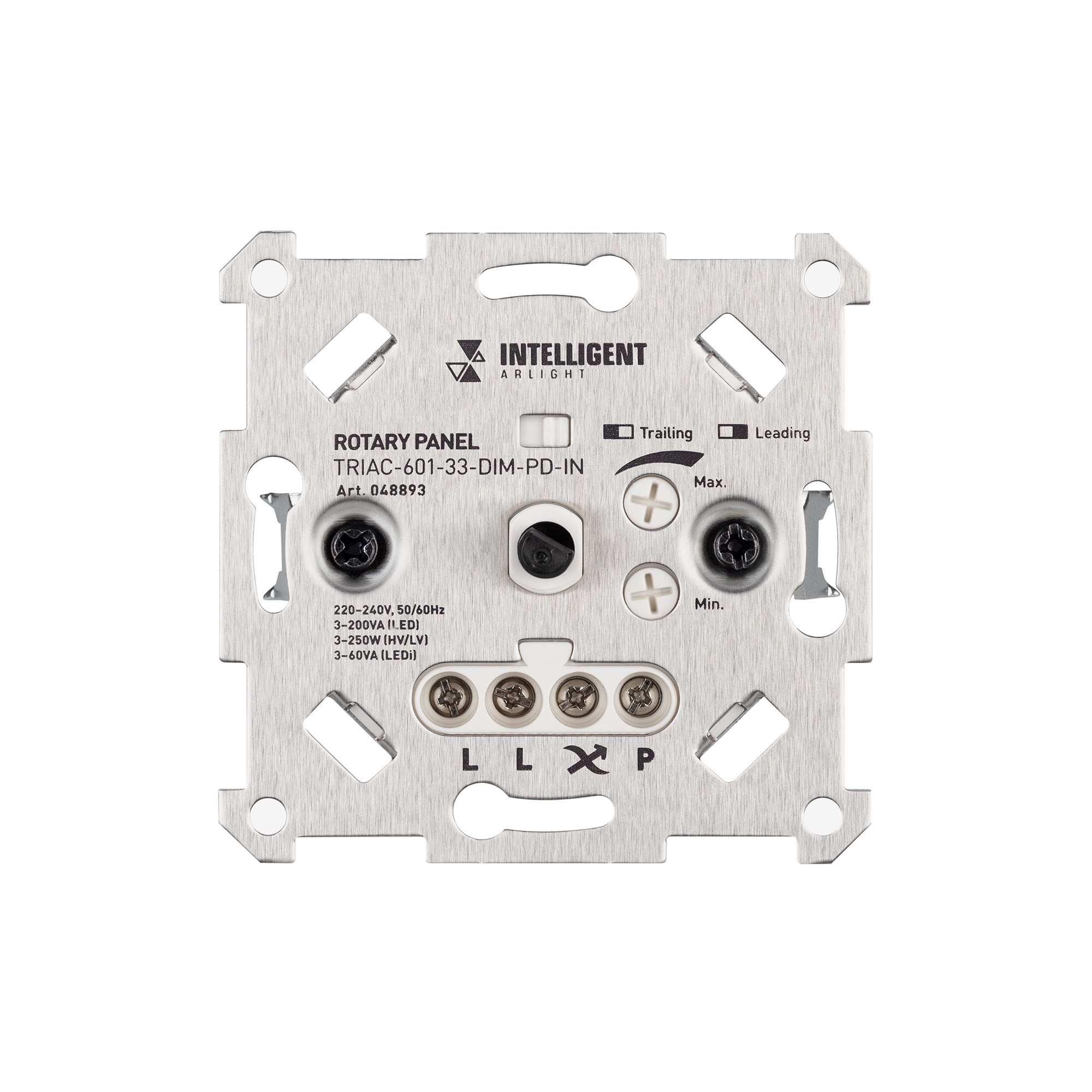 Встраиваемая роторная панель, предназначенная для управления светодиодными или другими источниками света с напряжением питания 230В. Панель позволяет включать и выключать свет и регулировать его яркость. Есть регулировка ограничения минимального и максимального уровня яркости. Не требует подключения N провода. Работает в режимах Leading Edge / Trailing Edge, диммирование по переднему / заднему фронту, выбор режима производится с помощью DIP-переключателя на корпусе. Клеммы Push-Dim для управления с помощью возвратных нажимных выключателей. Удобное и точное управление при помощи вращающегося регулятора. Устанавливается в стандартную монтажную коробку. Декоративная накладка в комплект не входит. Механизм совместим с большинством европейских производителей электроустановочных изделий. Питание 230В, максимальная мощность для ламп накаливания 250 Вт в режиме TE, для светодиодных источников света 200 ВА в режиме TE. Габариты устройства 70.6х70.6х35 мм.