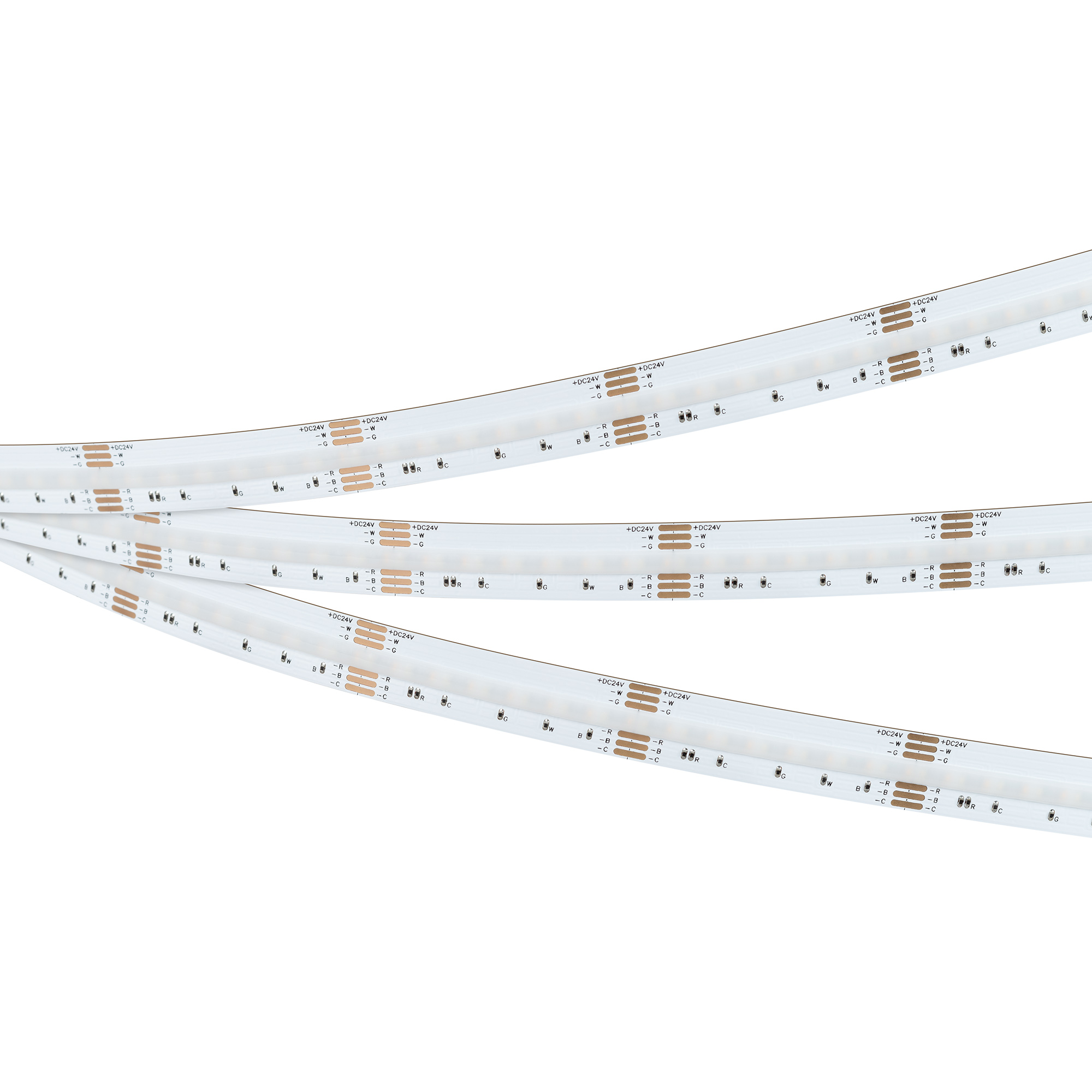 Мультицветная светодиодная лента сплошного свечения COB серии X840, Светодиоды CSP, 840 светодиодов на метр, мощность 16 Вт/м. Предназначена для мультицветной декоративной подсветки интерьера, торцевой подсветки, подсветки стеклянных полок, элементов мебели, ниш, декора. Используется для рекламных конструкций и витрин. Сочетание белых MIX и RGB светодиодов позволяет создавать интерьер с широким выбором цветов свечений. Высокий индекс цветопередачи CRI>90 обеспечивает точное восприятие оттенков при освещении любых интерьеров. Пятиканальная лента с шестью проводами для подключения. Обязательна установка на профиль.