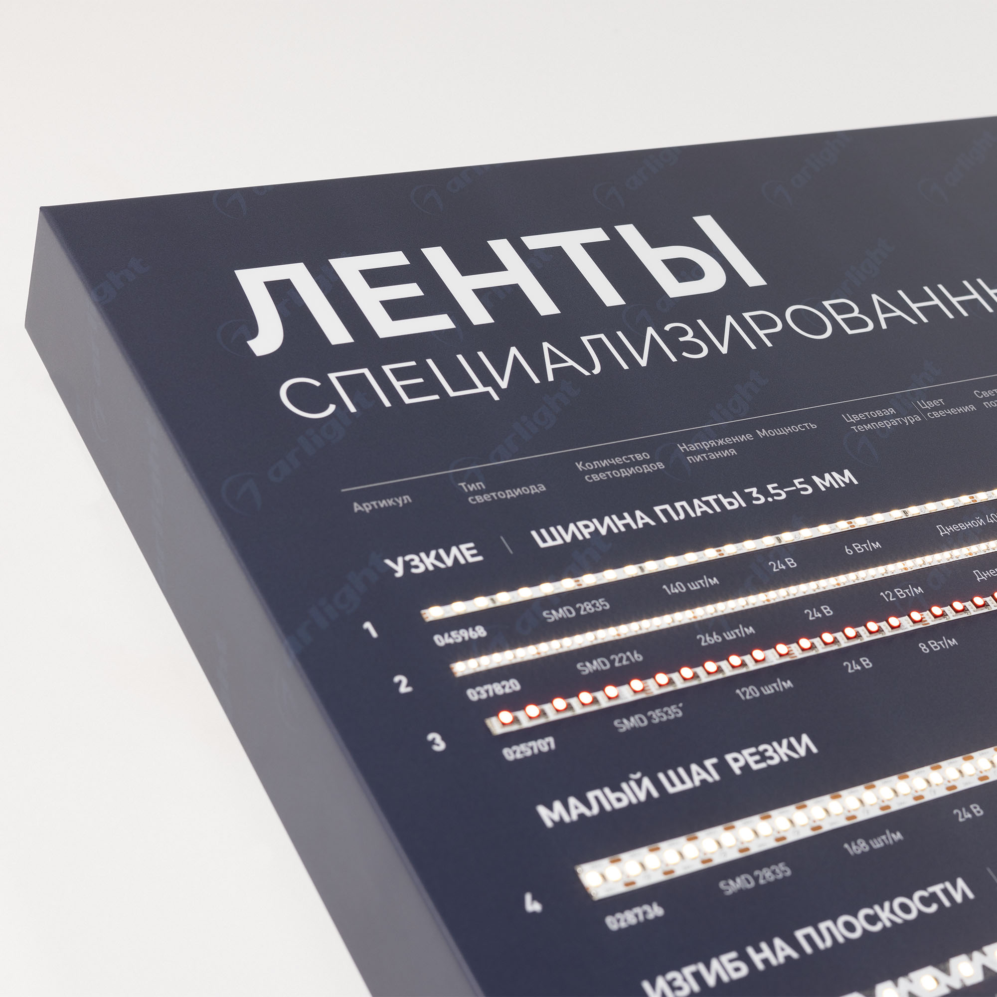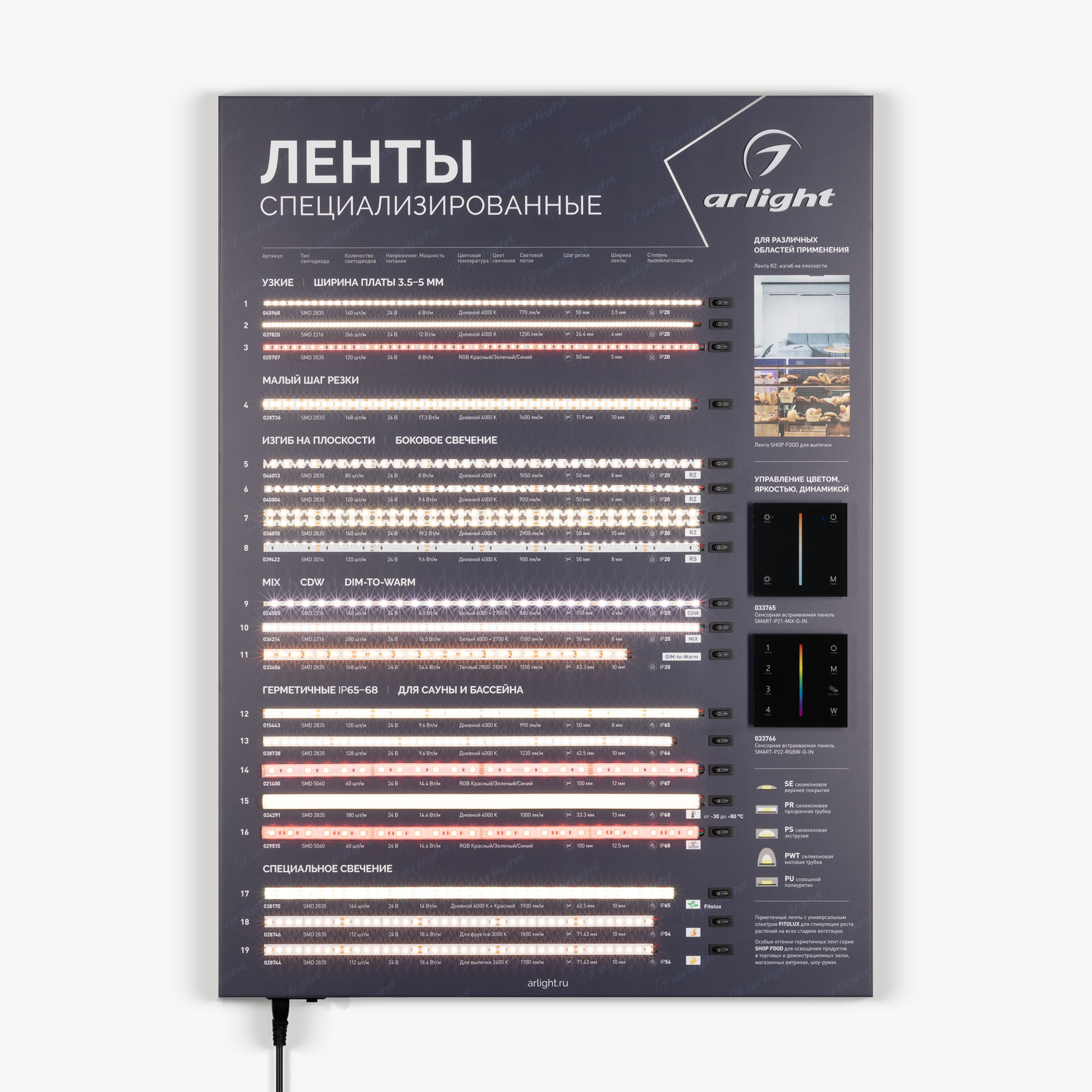 На стенде представлены ленты для решения специализированных задач освещения: узкие, с кратностью реза в 1 светодиод, стабилизированные (с подключением до 50 м), для изогнутых поверхностей, герметичные (IP65–68), для саун и бассейнов, с линзами 160°, для подсветки витрин (со смещенным спектром, продуктовая линейка), UVA (ультрафиолет).
