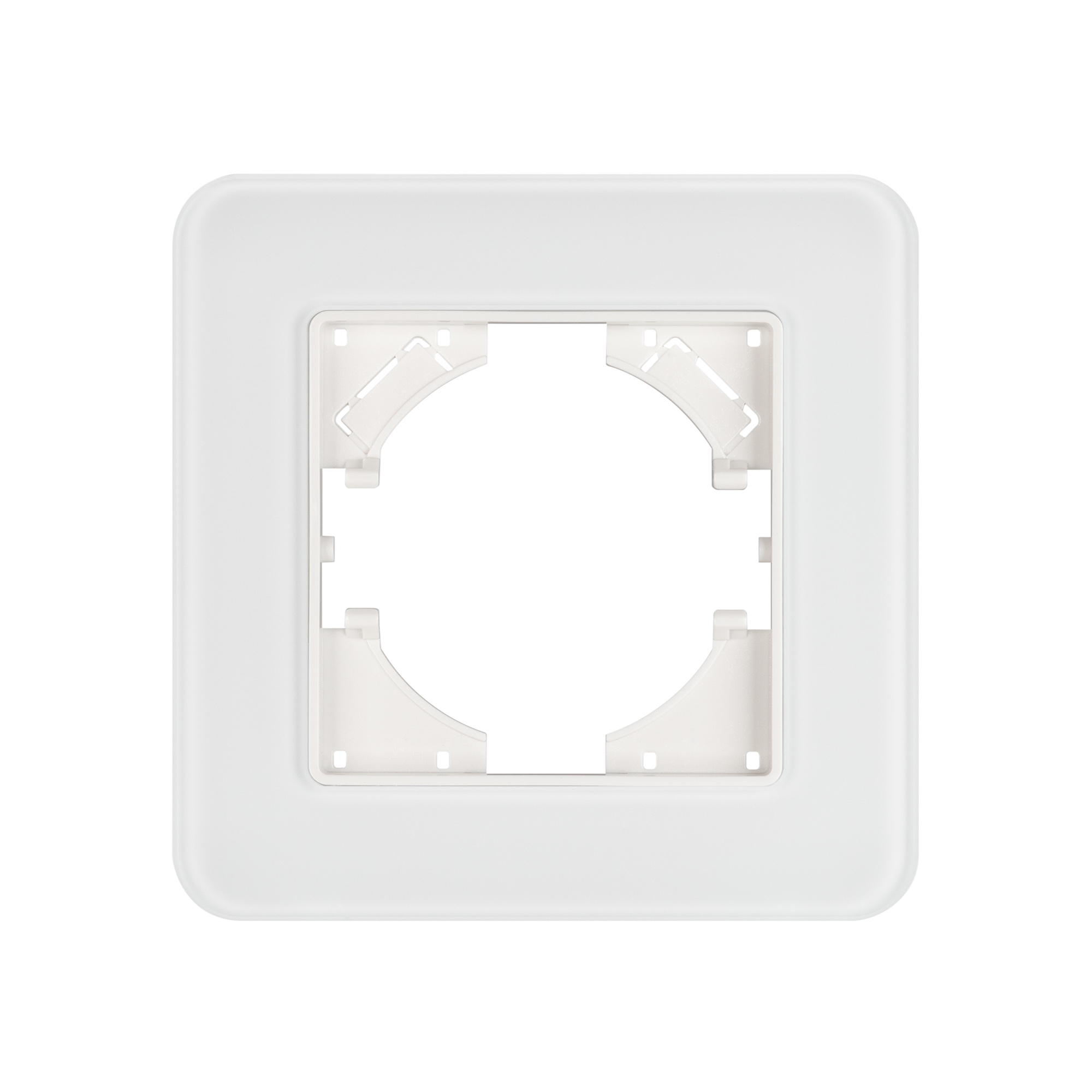 Рамка стеклянная на 1 пост, под встраиваемый механизм. Цвет - белый с Soft-Touch покрытием. Уровень герметичности IP20. Ориентация монтажа - горизонтальная (основным ориентиром служат посадочные выступы для накладки механизма).