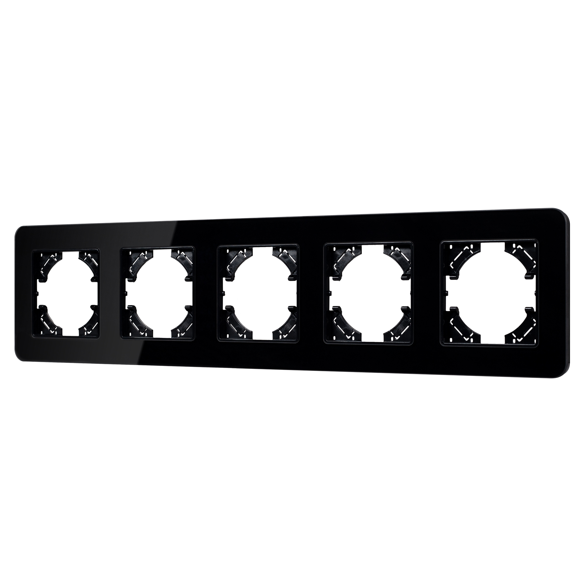 Рамка стеклянная на 5 постов, под встраиваемый механизм. Цвет - черный. Уровень герметичности IP20. Ориентация монтажа - горизонтальная (основным ориентиром служат посадочные выступы для накладки механизма).
