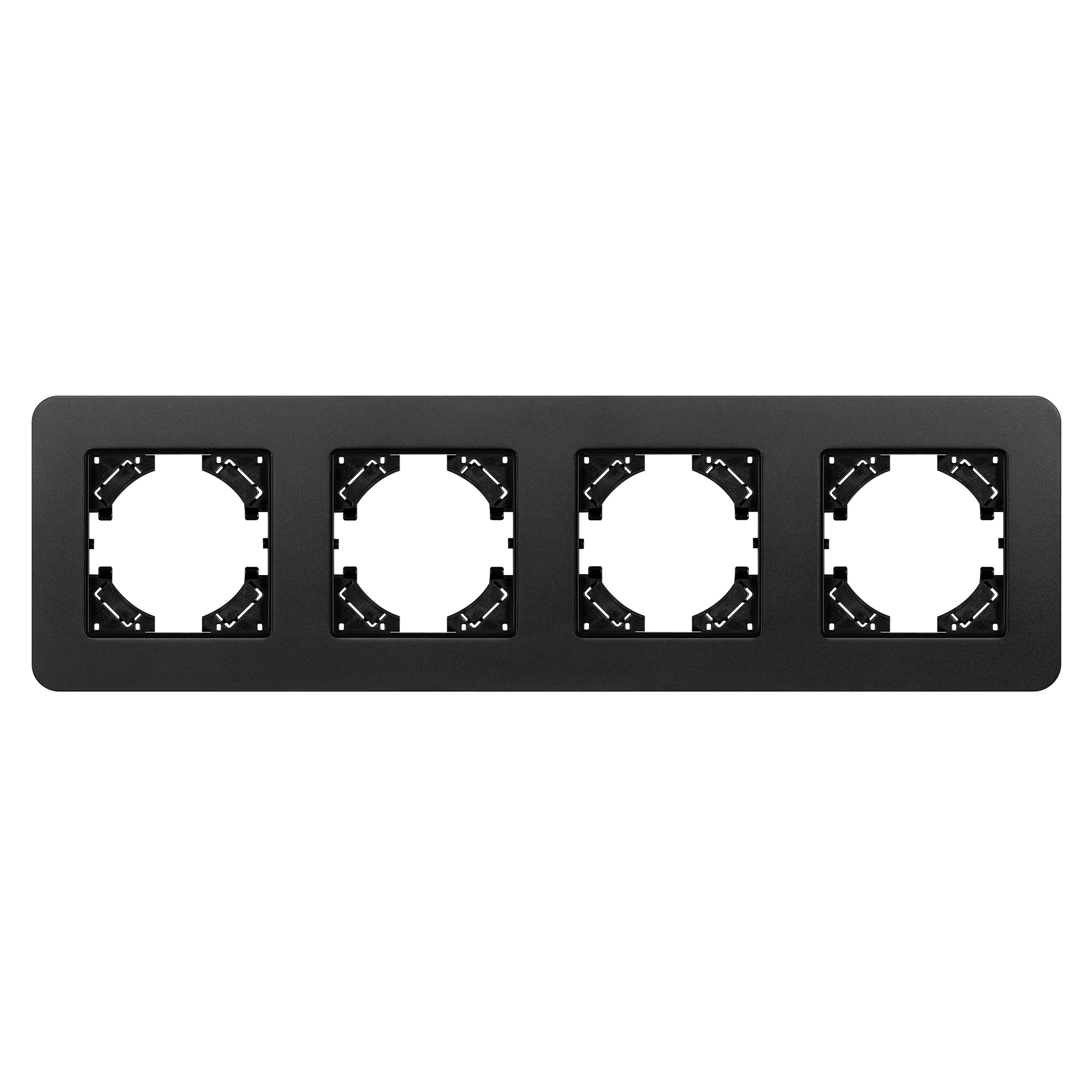 Рамка алюминиевая на 4 поста, под встраиваемый механизм. Цвет - черный с Soft-Touch покрытием. Уровень герметичности IP20. Ориентация монтажа - горизонтальная (основным ориентиром служат посадочные выступы для накладки механизма).