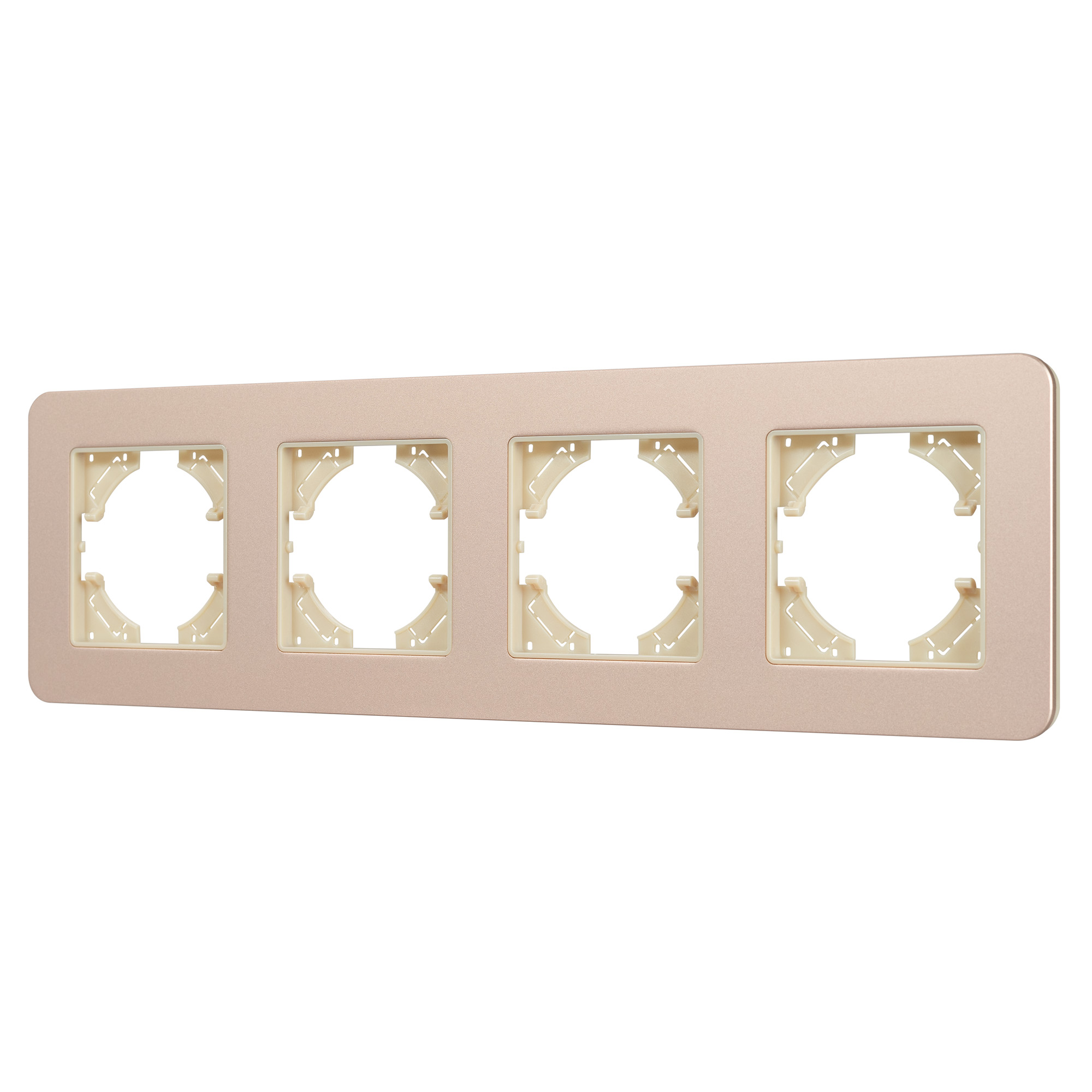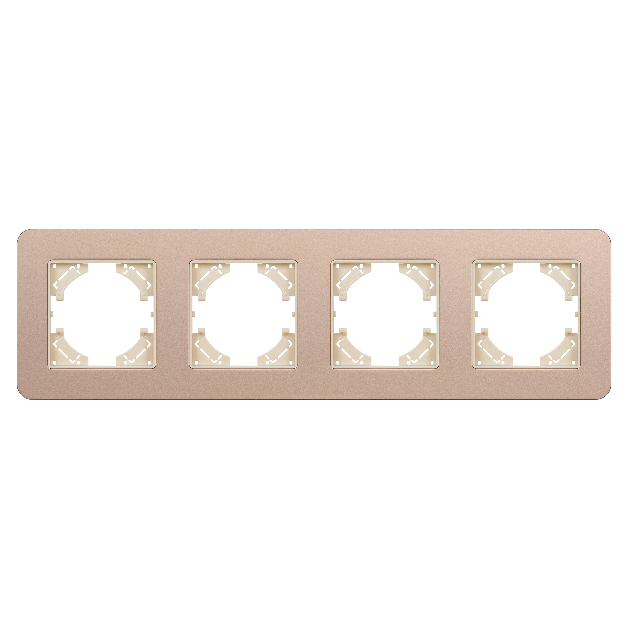 Рамка алюминиевая на 4 поста, под встраиваемый механизм. Цвет - золотой с Soft-Touch покрытием. Уровень герметичности IP20. Ориентация монтажа - горизонтальная (основным ориентиром служат посадочные выступы для накладки механизма).