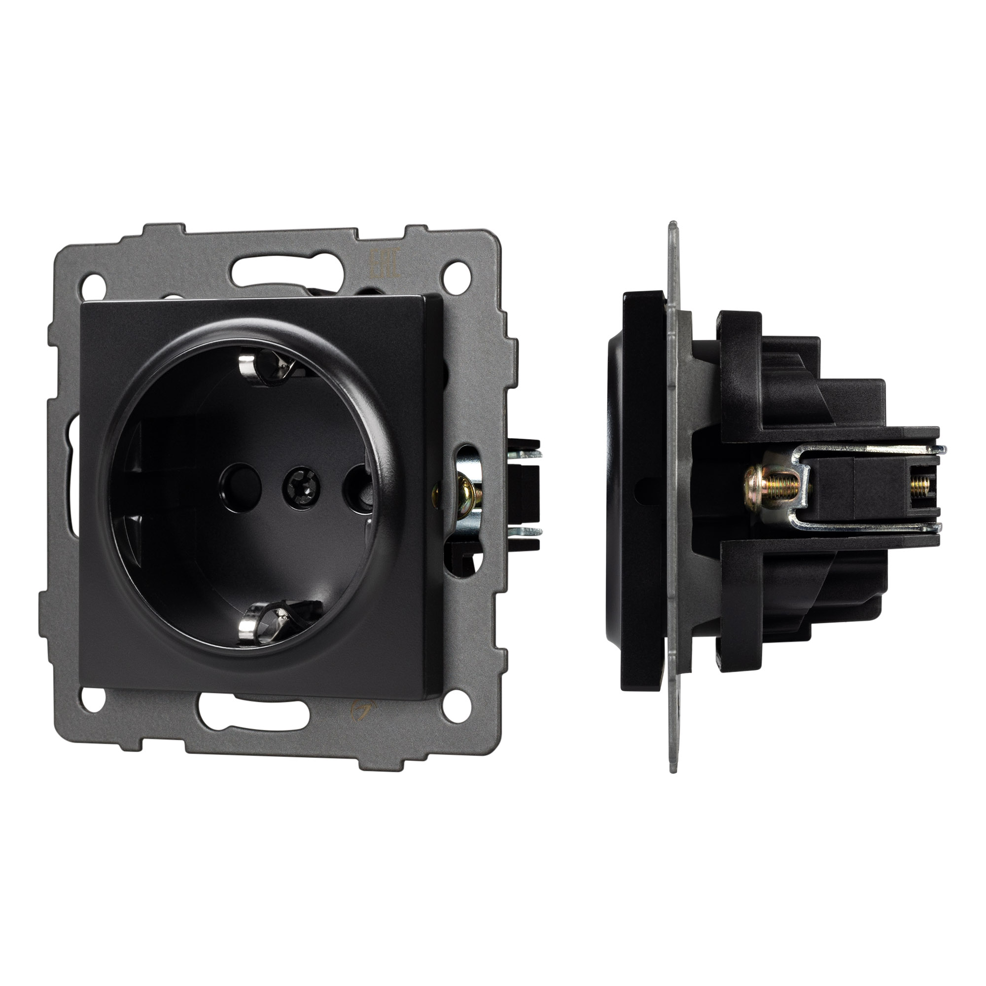 Механизм розетки с заземлением на 1 пост. Цвет - черный. Без фронтальной рамки. Уровень пылевлагозащиты IP20. Устанавливается в стандартный подрозетник.
