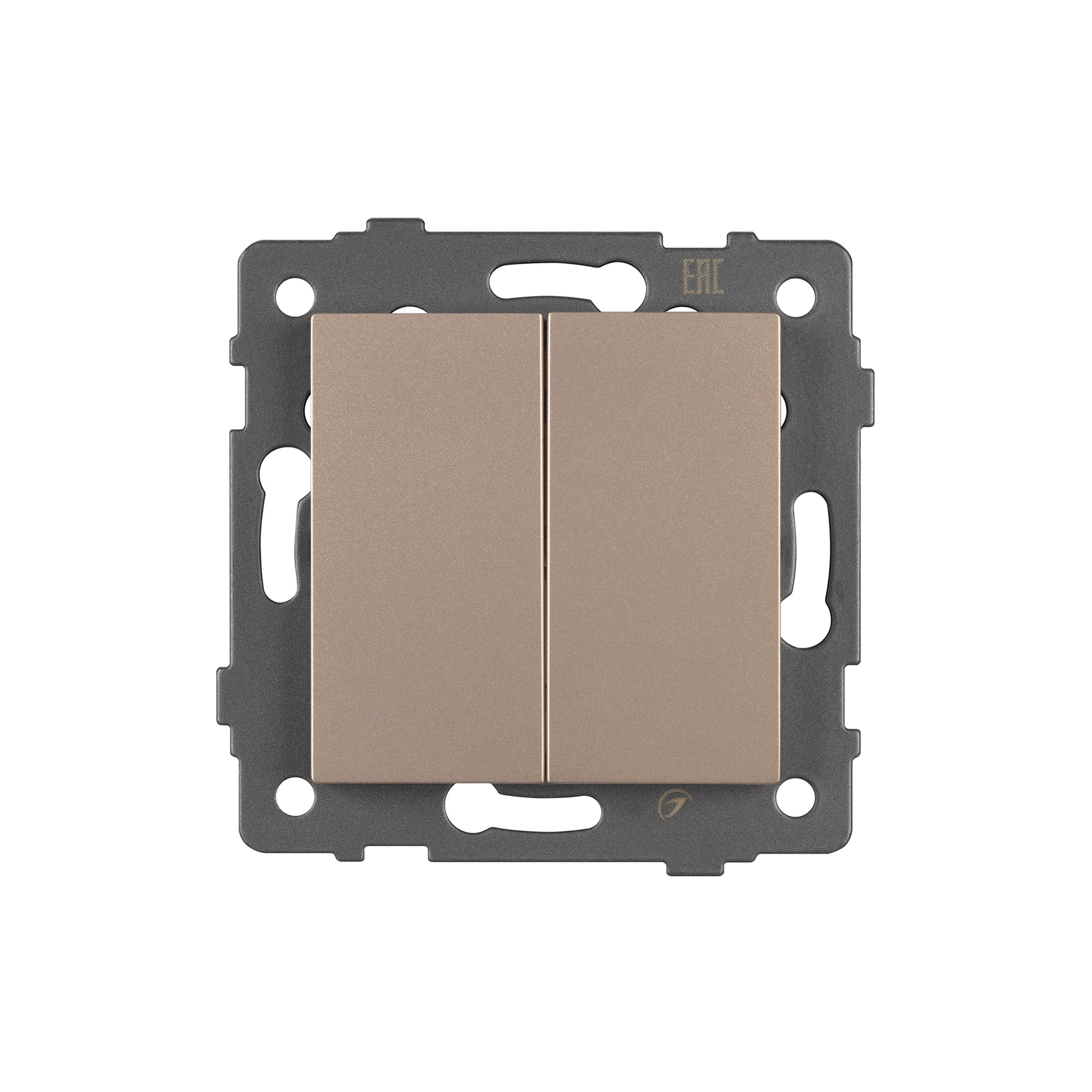 Механизм выключателя света клавишный на 1 пост 2 возвратные клавиши. Цвет - золотой. Без фронтальной рамки. Уровень пылевлагозащиты IP20. Выключатель устанавливается в стандартный круглый подрозетник.