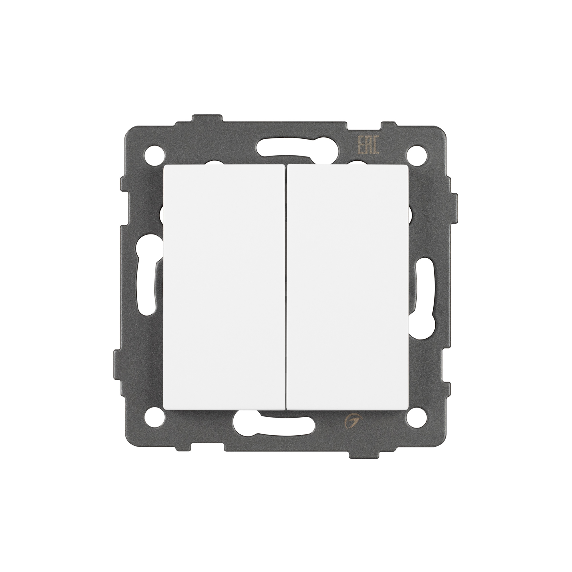 Механизм выключателя света клавишный на 1 пост 2 клавиши (непроходной). Цвет - белый. Без фронтальной рамки. Уровень пылевлагозащиты IP20. Выключатель устанавливается в стандартный круглый подрозетник.