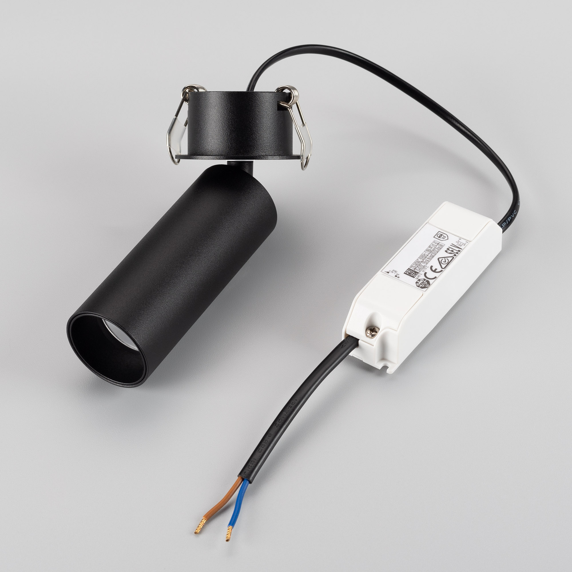 Светильник встраиваемый откидной. Мощность 7 Вт, св. поток 580 лм, 82 лм/Вт, дневной 4000 K, CRI>90, угол 36°, напряжение питания 230 В. Черный круглый корпус из алюминия, экран PMMA, степень защиты IP40. Размер: диаметр 35 мм, высота светового модуля 90 мм, высота основания 1.5 мм. Угол поворота 350°, угол наклона 90°. Монтаж встраиваемый, установочное отверстие: диаметр 45 мм, глубина 29 мм. Драйвер в комплекте 30-40 В, 150 мA, пульсация <1%.