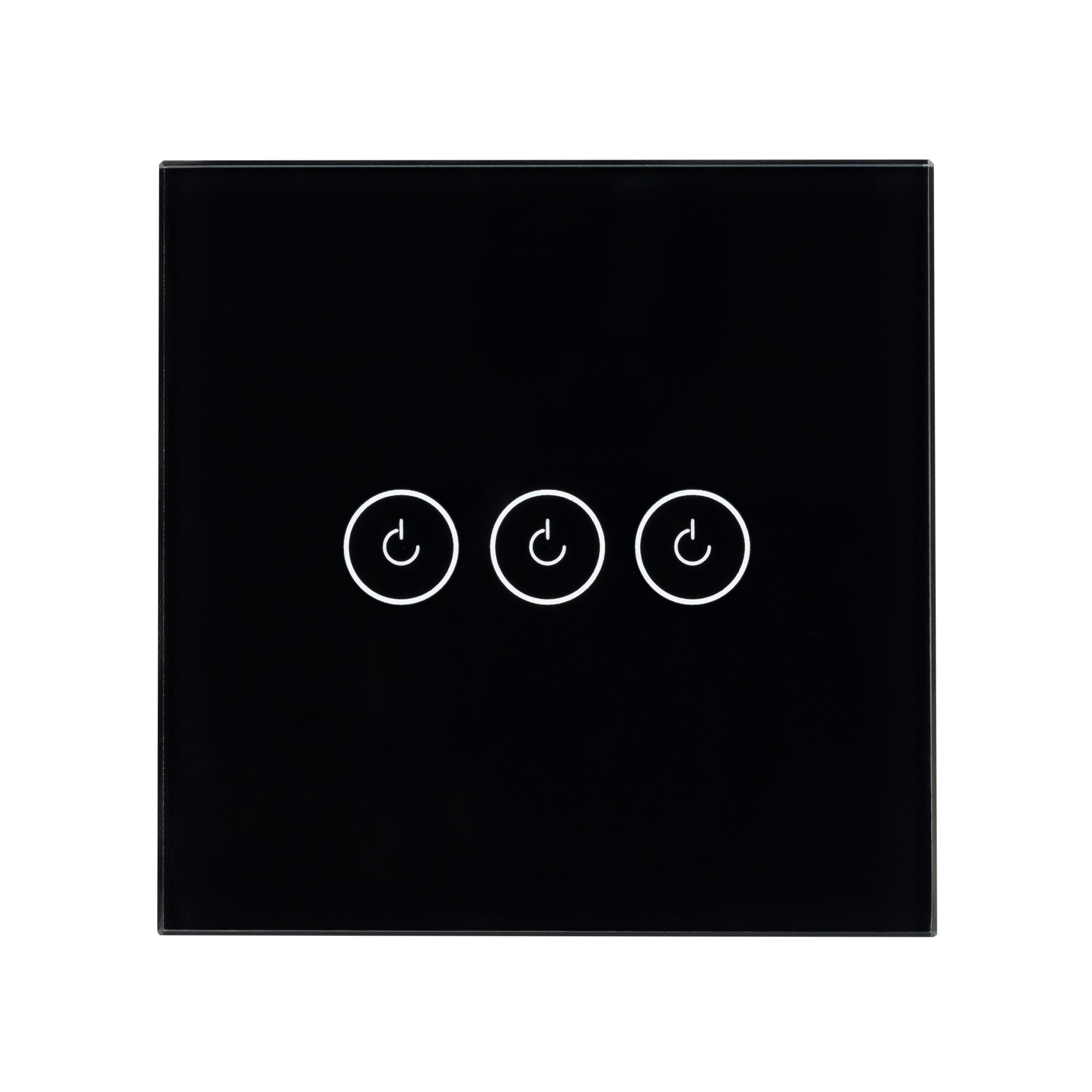Сенсорный выключатель света на 1 пост 3 клавиши. Цвет - черный. Клавиши имеют статичную LED подсветку - синего свечения. Уровень пылевлагозащиты IP20. Выключатель устанавливается в стандартный круглый подрозетник круглого сечения диаметром 60мм. Габаритные размеры: длина 86 мм, ширина 86 мм, высота 35 мм (9 мм высота от стены). Гарантийный срок 24 мес. *Без подключения нейтрали (нуля).