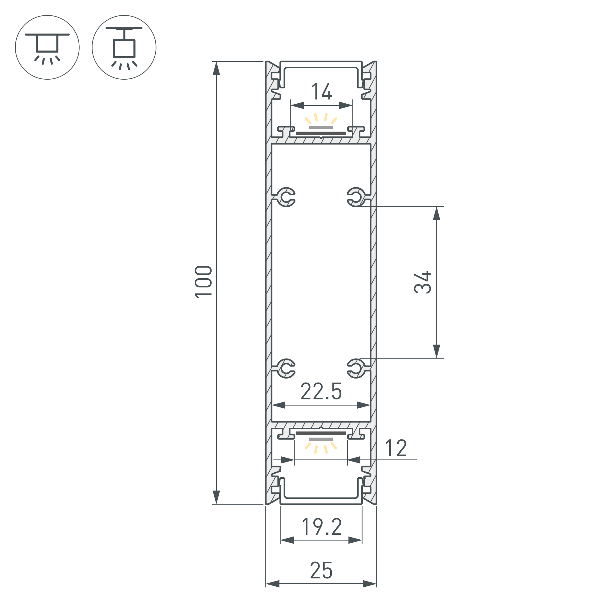 Габаритные размеры профиля составляют 2500 мм в длину, 25 мм в ширину и 100 мм в высоту. Площадки для установки светодиодных лент позволяют использовать ленты шириной до 12 мм и мощностью до 33 Вт/м. Это обеспечивает гибкость в выборе светодиодных лент и создает потрясающие световые решения.