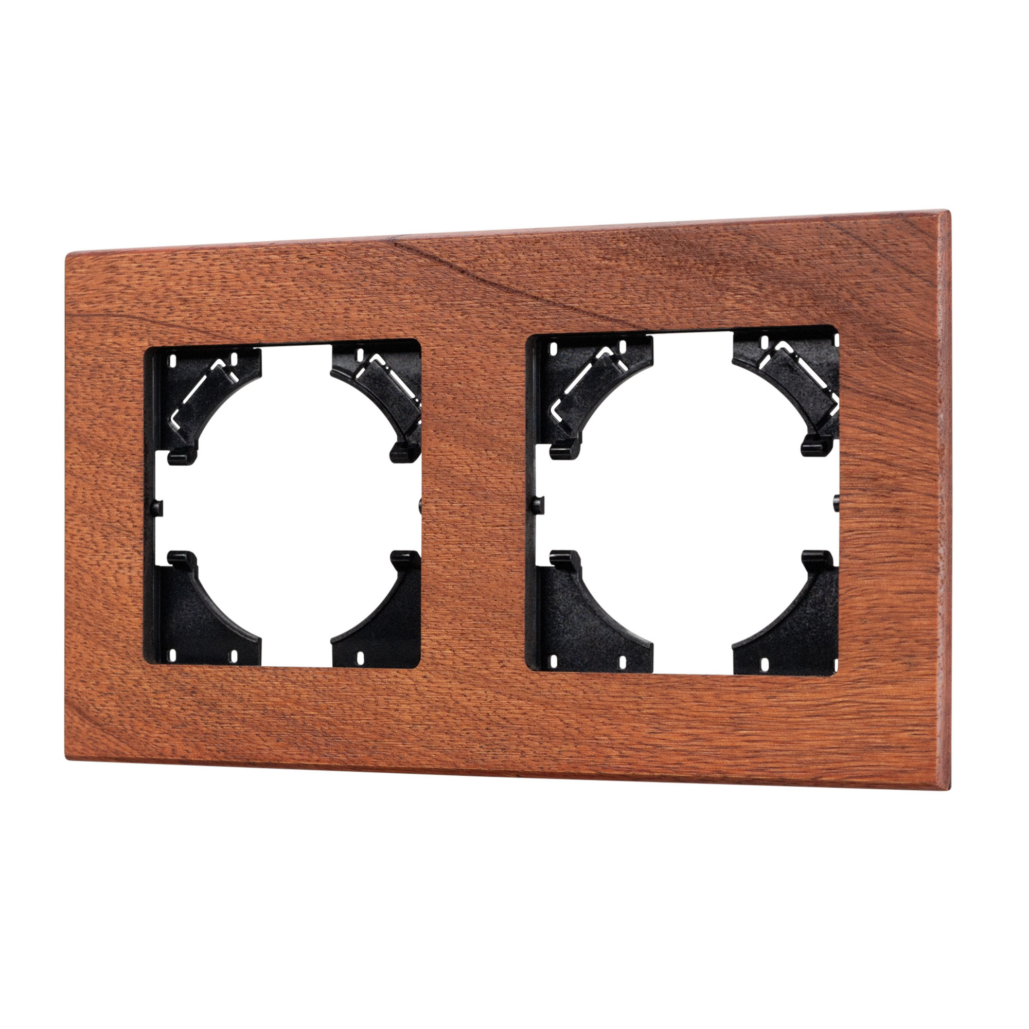 Рамка пластиковая на 2 поста, под встраиваемый механизм, с накладкой из натурального дерева. Цвет накладки - натуральное дерево*, цвета рамки - черный. Уровень герметичности IP20. Ориентация монтажа - горизонтальная (основным ориентиром служат посадочные выступы для накладки механизма).