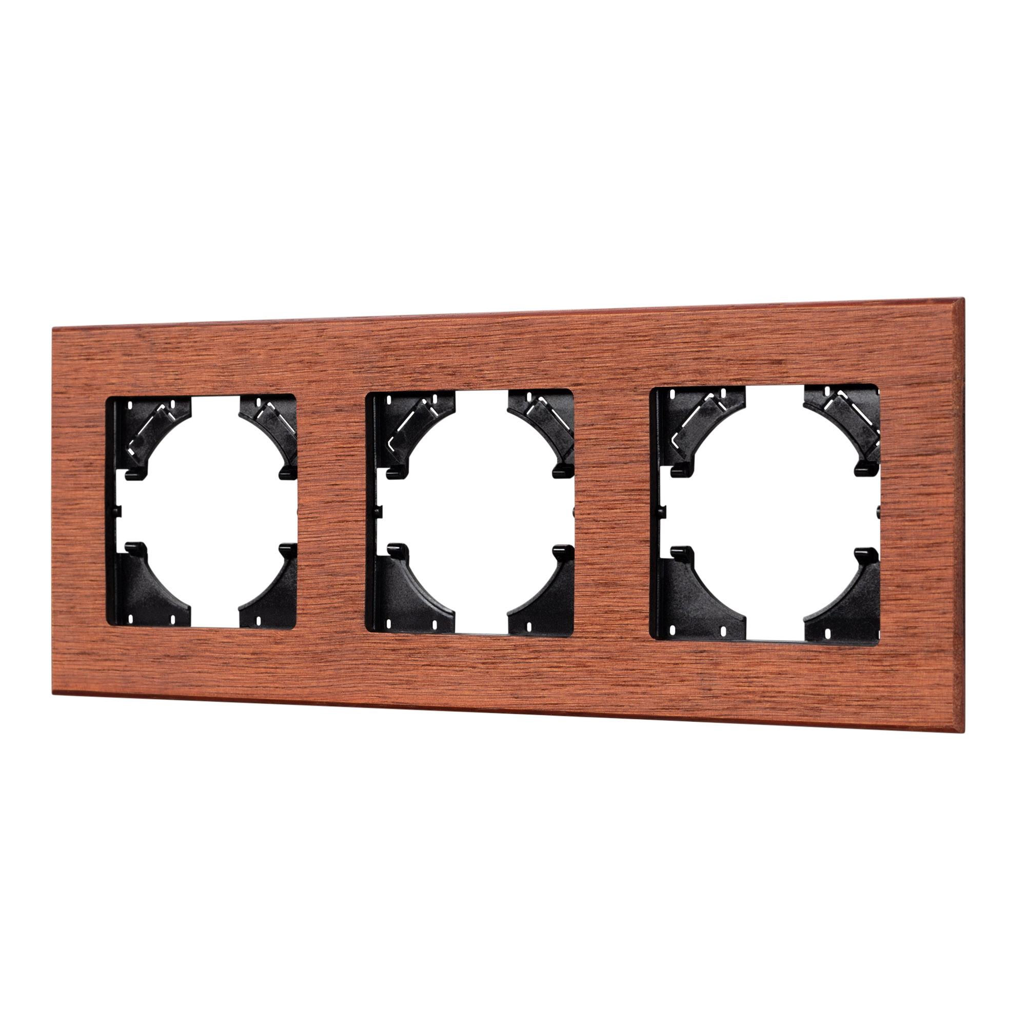 Рамка пластиковая на 3 поста, под встраиваемый механизм, с накладкой из натурального дерева. Цвет накладки - натуральное дерево*, цвет рамки - черный. Уровень герметичности IP20. Ориентация монтажа - горизонтальная (основным ориентиром служат посадочные выступы для накладки механизма).