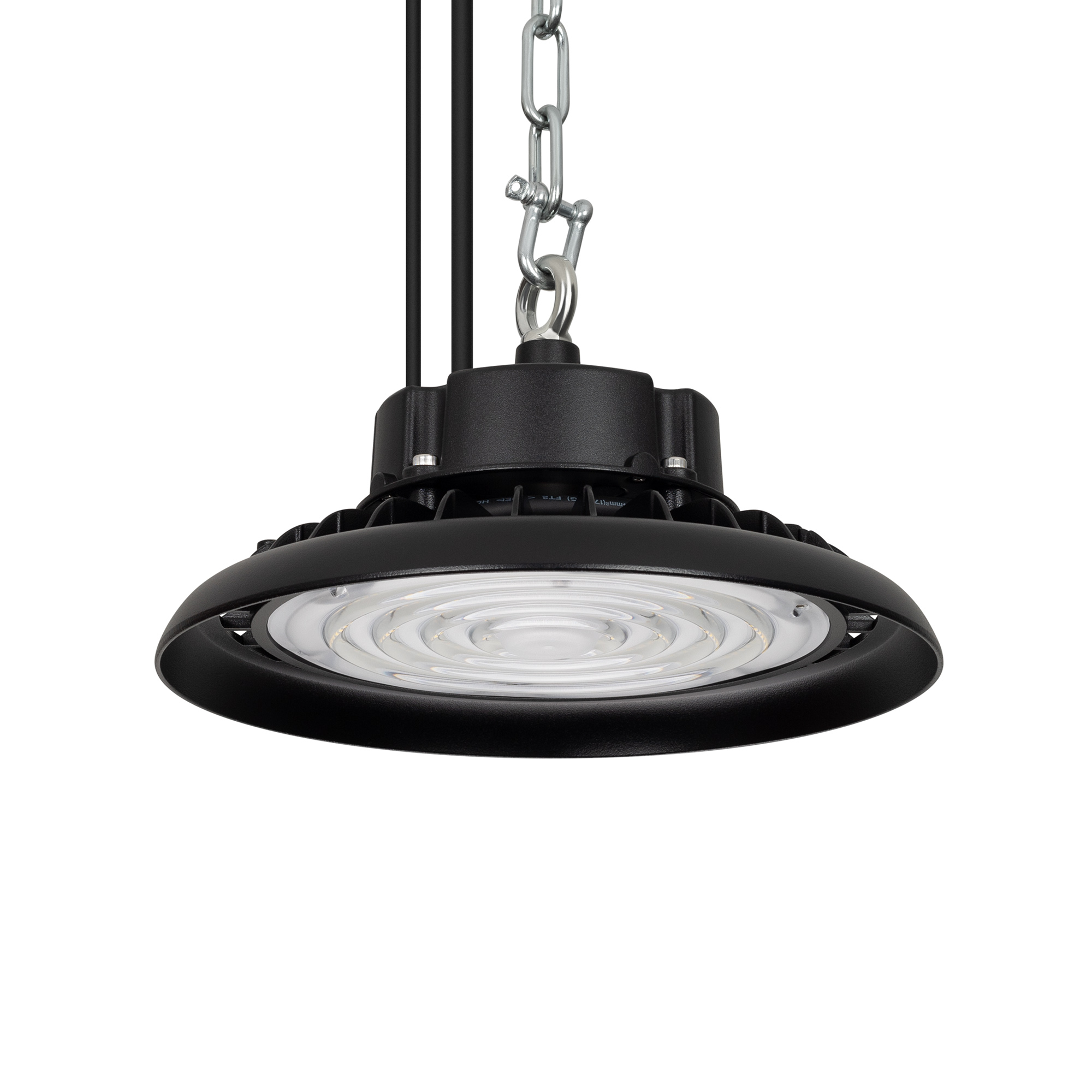 Светильник для освещения складских и промышленных помещений. Мощность 100W, напряжение питания AC 120-270V/50Hz. CRI 80. Тип светодиодов SMD2835, с групповой оптической линзой. Цвет свечения ДНЕВНОЙ 5000K, световой поток 15000 Lm, угол рассеивания 90°. Доступно управление по протоколу 0-10В. Цвет корпуса черный, линза из поликарбоната, степень влагозащиты IP65, ударопрочность IK08. Габариты Ф260xH140мм. Рым-болт в комплекте. Длина кабеля питания 900 мм, кабеля 0-10 200мм.