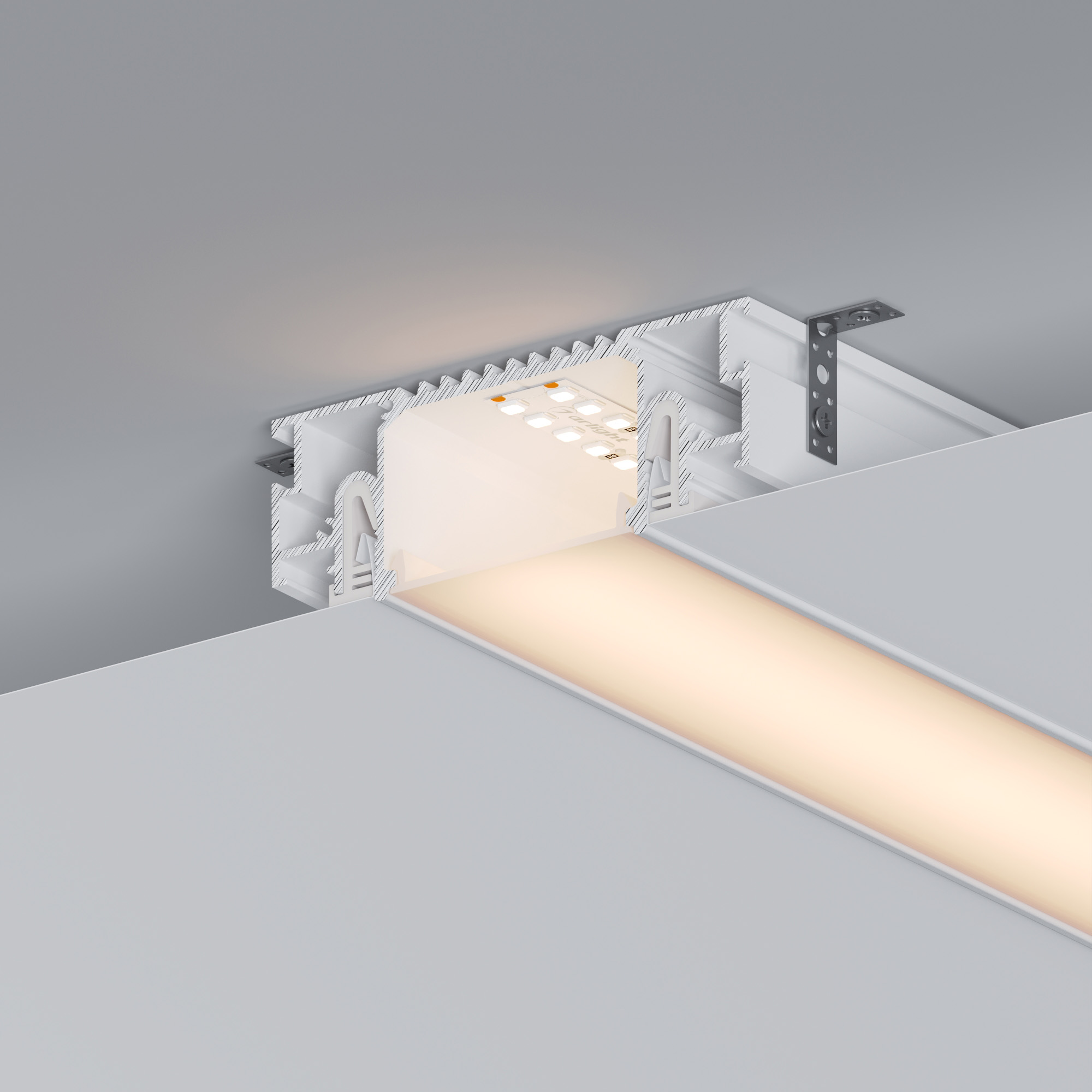 Встраиваемый алюминиевый профиль белого цвета (центральная линия) для дизайнерских решений «линии света» в натяжных потолках. Решение 2-в-1: служит каркасом для крепления натяжного потолка и профилем для установки светодиодной ленты. Подходит для тканевых и ПВХ потолков.