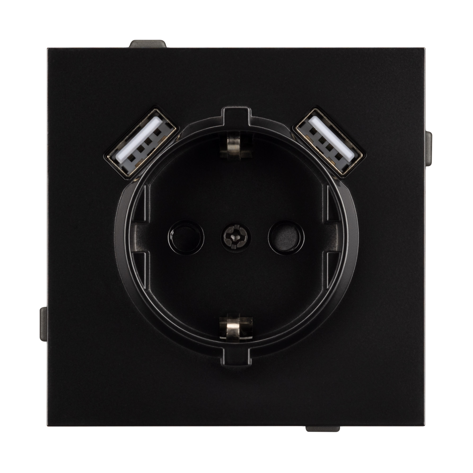 Механизм розетки с USB зарядкой, совместимый с рамками серии TENDO, создает утонченный минималистичный вид. Наличие двух USB Type A портов позволяет существенно сократить количество используемых розеточных постов под евровилку, сохраняя единую стилистику интерьера всего современного дизайн-проекта. Видимая часть механизма выполнена из высококачественного пластика черного цвета и имеет матовое покрытие, что придает изделию приятные тактильные ощущения и стильный внешний вид. Розетка оснащена заземляющими контактами и защитными шторками, обеспечивая надежное и безопасное подключение электроприборов. Контактная часть присоединяется при помощи винтовых зажимов, позволяя надежно подсоединить механизм выключателя к питающим элементам. А усиленные распорные лапки двойного захвата надежно фиксируют механизм в установочном подрозетнике круглого сечения диаметром от 60мм. Суппорт окрашен в черный матовый цвет под основу механизма и выполнен из металла толщиной 1,5мм, что обеспечивает безопасность и уверенность в установке. На каждой стороне суппорта размещены фиксирующие элементы, позволяющие комбинировать механизмы в системы до 5шт как горизонтально, так и вертикально.